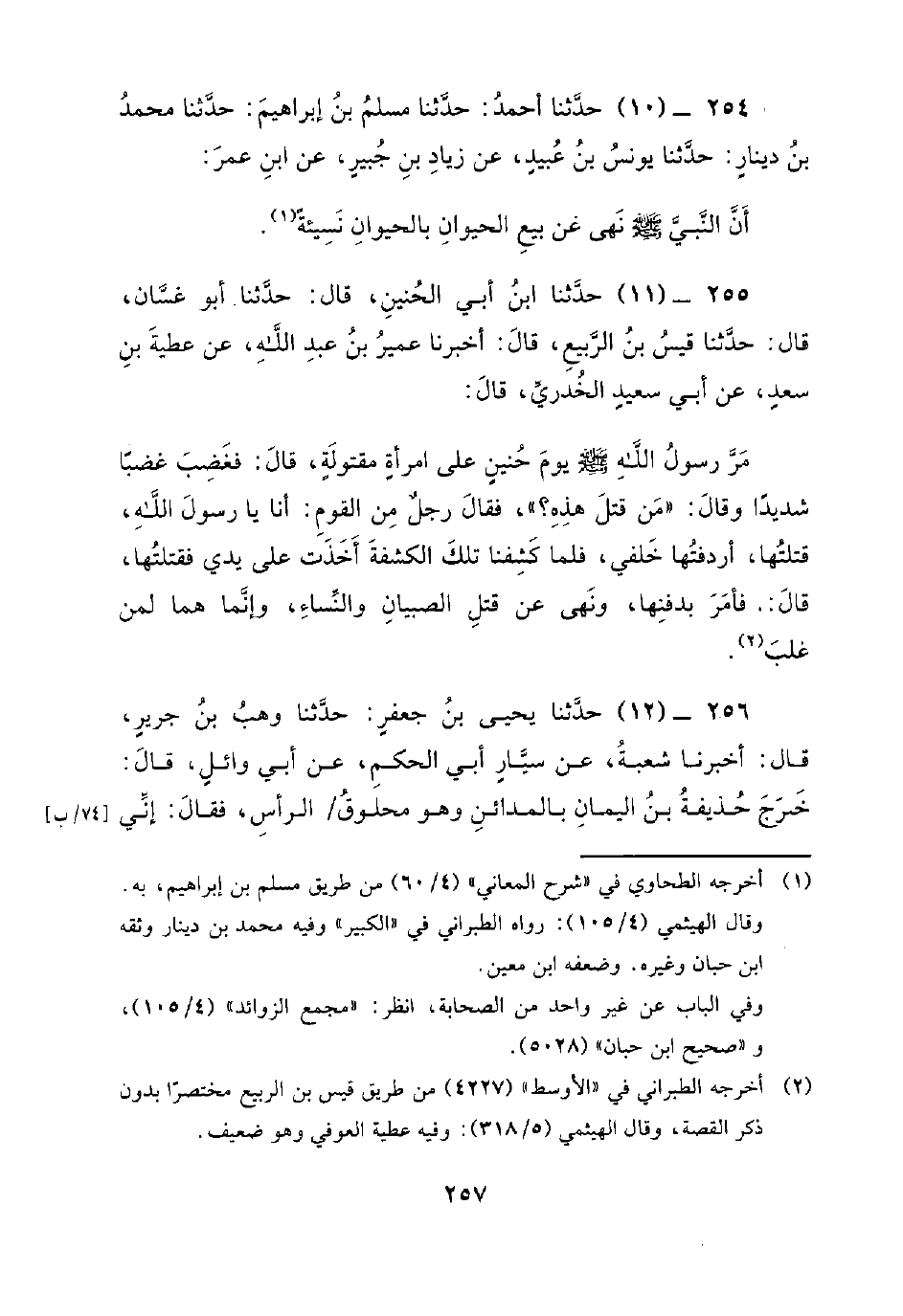 255 - (11) حَدَّثَنَا ابْنُ أَبِي الْحُنَيْنِ، قَالَ: حَدَّثَنَا أَبُو غَسَّانَ، قَالَ: حَدَّثَنَا قَيْسُ بْنُ الرَّبِيعِ، قَالَ: أَخْبَرَنَا عُمَيْرُ بْنُ عَبْدِ اللَّهِ، عَنْ عَطِيَّةَ بْنِ سَعْدٍ، عَنْ أَبِي سَعِيدٍ الْخُدْرِيِّ، قَالَ: مَرَّ رَسُولُ اللَّهِ صَلَّى اللَّهُ عَلَيْهِ وَسَلَّمَ يَوْمَ حُنَيْنٍ عَلَى امْرَأَةٍ مَقْتُولَةٍ، قَالَ: فَغَضِبَ غَضَبًا شَدِيدًا وَقَالَ: مَنْ قَتَلَ هَذِهِ؟، فَقَالَ رَجُلٌ مِنَ الْقَوْمِ: أنا يَا رَسُولَ اللَّهِ، قَتَلْتُهَا، أَرْدَفْتُهَا خَلْفِي، فَلَمَّا كَشَفْنَا تِلْكَ الْكَشْفَةَ أَخَذَتْ عَلَى يَدِي فَقَتَلْتُهَا، قَالَ: فَأَمَرَ بِدَفْنِهَا، وَنَهَى عَنْ قَتْلِ الصِّبْيَانِ وَالنِّسَاءِ، وَإِنَّمَا هُمَا لمن غلب.