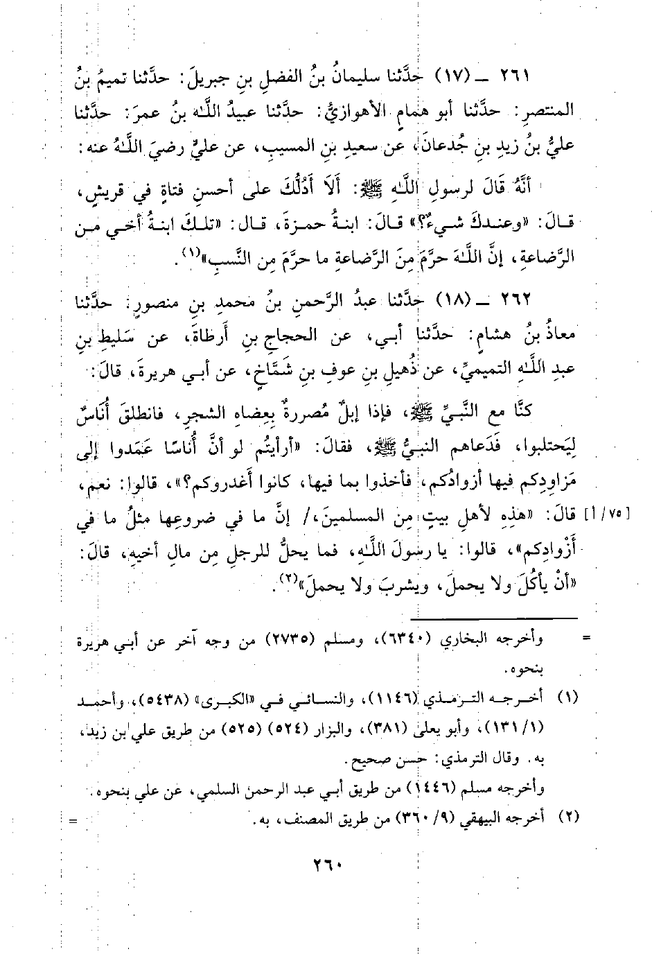 261 - (17) حَدَّثَنَا سُلَيْمَانُ بْنُ الْفَضْلِ بْنِ جِبْرِيلَ: حَدَّثَنَا تميم بن المنتصر: حدثنا أبو همام الأَهْوَازِيُّ: حَدَّثَنَا عُبَيْدُ اللَّهِ بْنُ عُمَرَ: حَدَّثَنَا عَلِيُّ بْنُ زَيْدِ بْنِ جُدْعَانَ، عَنْ سَعِيدِ بْنِ الْمُسَيِّبِ، عَنْ عَلِيٍّ رَضِيَ اللَّهُ عَنْهُ: أَنَّهُ قَالَ لِرَسُولِ اللَّهِ صَلَّى اللَّهُ عَلَيْهِ وَسَلَّمَ: أَلا أَدُلُّكَ عَلَى أَحْسَنِ فَتَاةٍ فِي قُرَيْشٍ، قَالَ: وَعِنْدَكَ شَيْءٌ؟ قَالَ: ابْنَةُ حَمْزَةَ، قَالَ: تِلْكَ ابْنَةُ أَخِي مِنَ الرَّضَاعَةِ، إِنَّ اللَّهَ حَرَّمَ مِنَ الرَّضَاعَةِ مَا حَرَّمَ مِنَ النَّسَبِ.