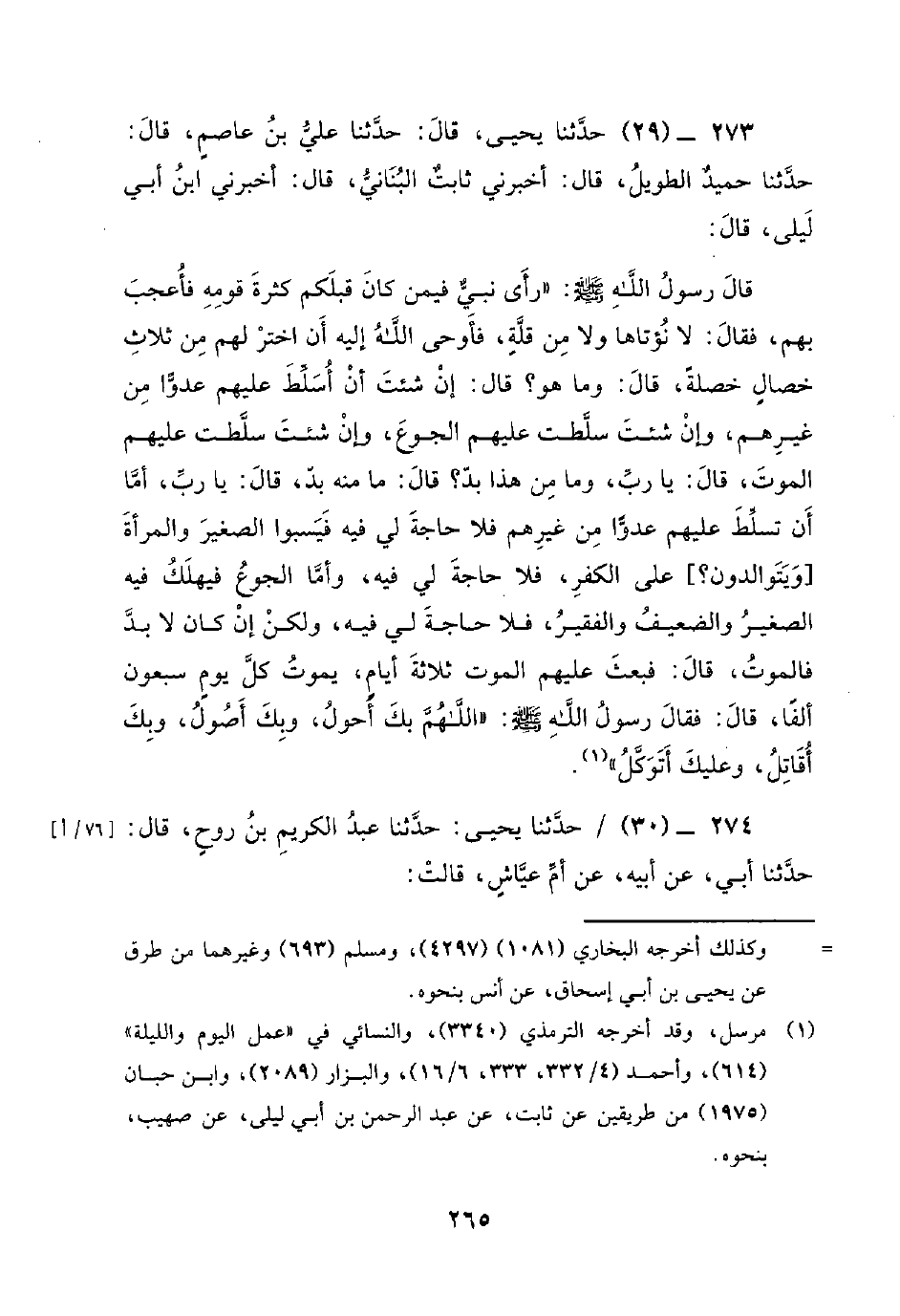 273 - (29) حَدَّثَنَا يَحْيَى، قَالَ: حَدَّثَنَا عَلِيُّ بْنُ عَاصِمٍ، قَالَ: حَدَّثَنَا حُمَيْدٌ الطَّوِيلُ، قَالَ: أَخْبَرَنِي ثَابِتٌ الْبَنَّانِيُّ، قَالَ: أَخْبَرَنِي ابْنُ أَبِي لَيْلَى قَالَ: قال رسول الله صلى الله عليه وسلم: رَأَى نَبِيٌّ فِيمَنْ كَانَ قَبْلَكُمْ كَثْرَةَ قَوْمِهِ فَأُعْجِبَ بِهِمْ، فَقَالَ: لا نُؤْتَاهَا وَلا مِنْ قِلَّةٍ، فَأَوْحَى اللَّهُ إِلَيْهِ أَنِ اخْتَرْ لَهُمْ مِنْ ثَلاثِ خِصَالٍ خَصْلَةً، قَالَ: وَمَا هُوَ؟ قَالَ: إِنْ شِئْتَ أَنْ أُسَلِّطَ عَلَيْهِمْ عَدُوًّا مِنْ غَيْرِهِمْ، وَإِنْ شِئْتَ سَلَّطْتُ عَلَيْهِمُ الْجُوعَ، وَإِنْ شِئْتَ سَلَّطْتُ عَلَيْهِمُ الْمَوْتَ، قَالَ: يَا رَبِّ، وَمَا مِنْ هَذَا بُدٌّ؟ قَالَ: مَا مِنْهُ بُدٌّ، قَالَ: يَا رَبِّ، أَمَّا أَنْ تُسَلِّطَ عَلَيْهِمْ عَدُوًّا مِنْ غَيْرِهِمْ فَلا حَاجَةَ لي فيه فيسبوا الصَّغِيرَ وَاْلمَرْأَةَ وَيَتَوَالَدُونَ؟ عَلَى الْكُفْرِ، فَلا حَاجَةَ لِي فِيهِ، وَأَمَّا الْجُوعُ فَيَهْلِكُ فِيهِ الصَّغِيرُ وَالضَّعِيفُ وَالْفَقِيرُ، فَلا حَاجَةَ لِي فِيهِ، وَلَكِنْ إِنْ كَانَ لا بُدَّ فَالْمَوْتُ، قَالَ: فَبَعَثَ عَلَيْهِمُ الْمَوْتَ ثَلاثَةَ أَيَّامٍ، يَمُوتُ كُلَّ يَوْمٍ سَبْعُونَ أَلْفًا، قَالَ: فَقَالَ رَسُولُ اللَّهِ صَلَّى اللَّهُ عَلَيْهِ وَسَلَّمَ: اللَّهُمَّ بِكَ أَحُولُ، وَبِكَ أَصُولُ، وَبِكَ أُقَاتِلُ، وَعَلَيْكَ أَتَوَكَّلُ.