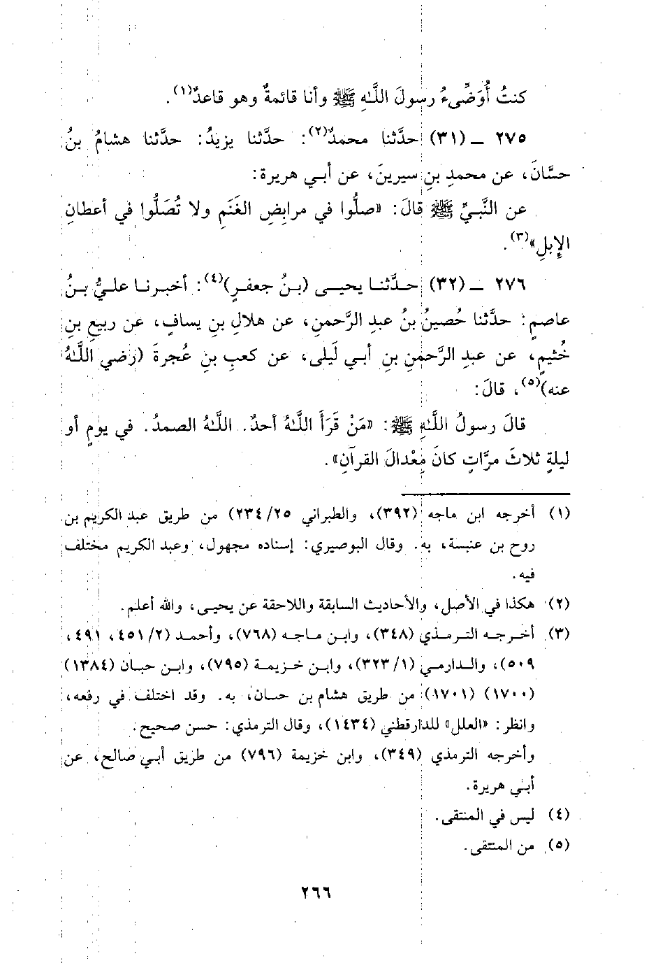 275 - (31) حَدَّثَنَا مُحَمَّدٌ: حَدَّثَنَا يَزِيدُ: حَدَّثَنَا هِشَامُ بْنُ حَسَّانٍ، عَنْ مُحَمَّدِ بْنِ سِيرِينَ، عَنْ أَبِي هُرَيْرَةَ: عَنِ النَّبِيِّ صَلَّى اللَّهُ عَلَيْهِ وَسَلَّمَ قَالَ: صَلُّوا فِي مَرَابِضِ الْغَنَمِ وَلا تُصَلُّوا فِي أَعْطَانِ الإِبِلِ.