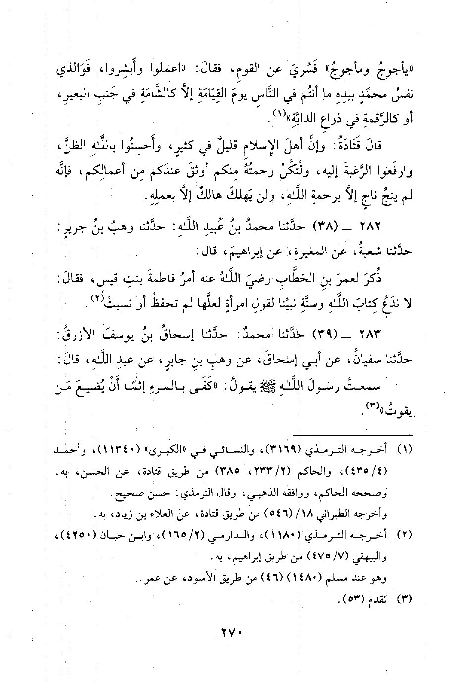 283 - (39) حَدَّثَنَا مُحَمَّدٌ: حَدَّثَنَا إِسْحَاقُ بْنُ يُوسُفَ الأَزْرَقُ: حَدَّثَنَا سُفْيَانُ، عَنْ أَبِي إِسْحَاقَ، عَنْ وَهْبِ بْنِ جَابِرٍ، عَنْ عَبْدِ اللَّهِ، قَالَ: سَمِعْتُ رسول الله صلى الله عليه وسلم يقول: كفى بالمرء إثما أن يضيع من يقوت.