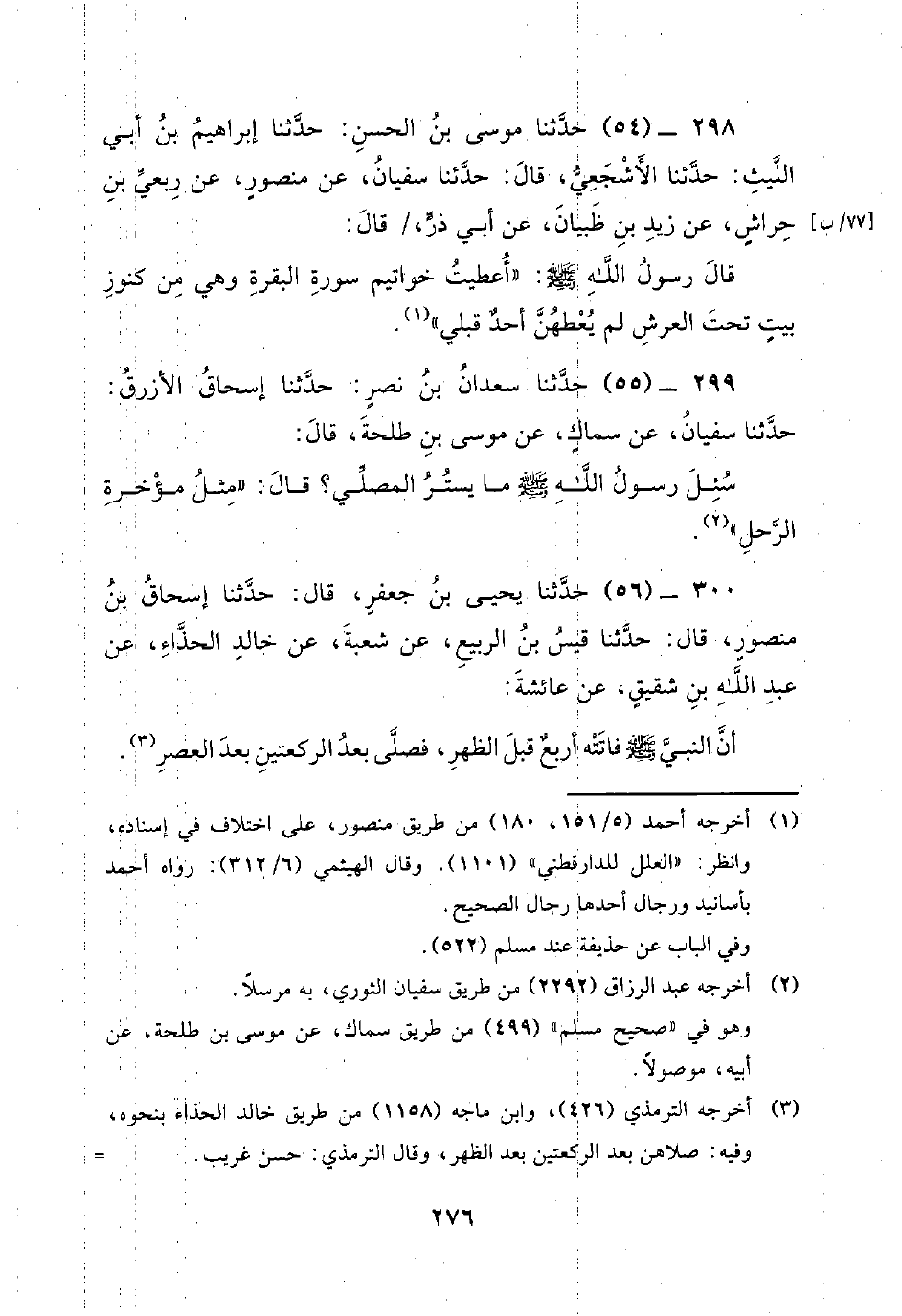 299 - (55) حدثنا سعدان بن نصر: حدثنا إسحاق الأزرق: حدثنا سفيان، عن سماك، عن موسى بن طلحة، قَالَ: سُئِلَ رَسُولِ اللَّهِ صَلَّى اللَّهُ عَلَيْهِ وَسَلَّمَ مَا يستر المصلي؟ قال: مثل مؤخرة الرحل.