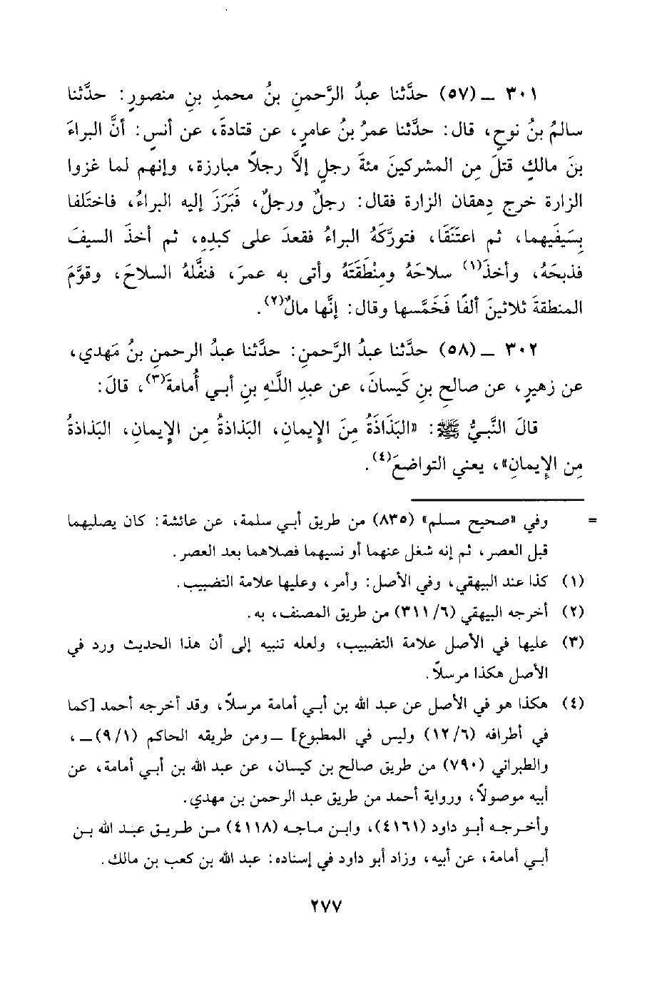 302 - (58) حدثنا عبد الرحمن: حدثنا عبد الرحمن بن مهدي، عن زهير، عن صالح بن كيسان، عن عبد الله بن أبي أمامة، قَالَ: قَالَ النَّبِيُّ صَلَّى اللَّهُ عَلَيْهِ وَسَلَّمَ البذاذة من الإيمان، البذاذة من الإيمان، البذاذة من الإيمان، يعني التواضع.