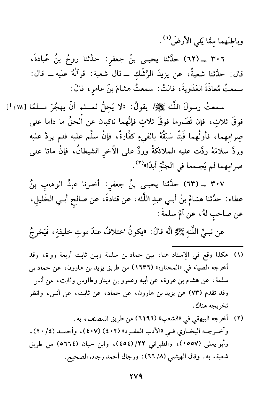 306 - (62) حدثنا يحيى بن جعفر: حَدَّثَنَا رَوْحُ بْنُ عُبَادَةَ، قَالَ: حَدَّثَنَا شُعْبَةُ، عن يزيد الرشك قال شعبة: قرأته عليه - قال: سمعت معاذة العدوية، قالت: سمعت هشام بن عامر، قَالَ: سَمِعْتُ رَسُولَ اللَّهِ صَلَّى اللَّهُ عَلَيْهِ وَسَلَّمَ / يقول: لا يحل لمسلم أن يهجر مسلما فوق ثلاث، فإن تصارما فوق ثلاث فإنهما ناكبان عن الحق ما داما على صرامهما، فأولهما فيئا سبقه بالفيء كفارة، فإن سلم عليه فلم يرد عليه ورد سلامه ردت عليه الملائكة ورد على الآخر الشيطان، فإن ماتا على صرامهما لم يجتمعا في الجنة أبدا.
