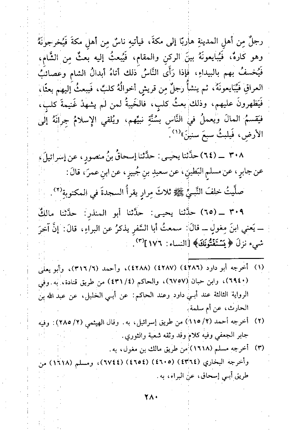 309 - (65) حدثنا يَحْيَى: حدثنا أبو المنذر: حدثنا مالك يعني ابن مغول قال: سمعت أبا السفر يذكر عن البراء، قال: {إن آخر شيء نزل يستفتونك}.