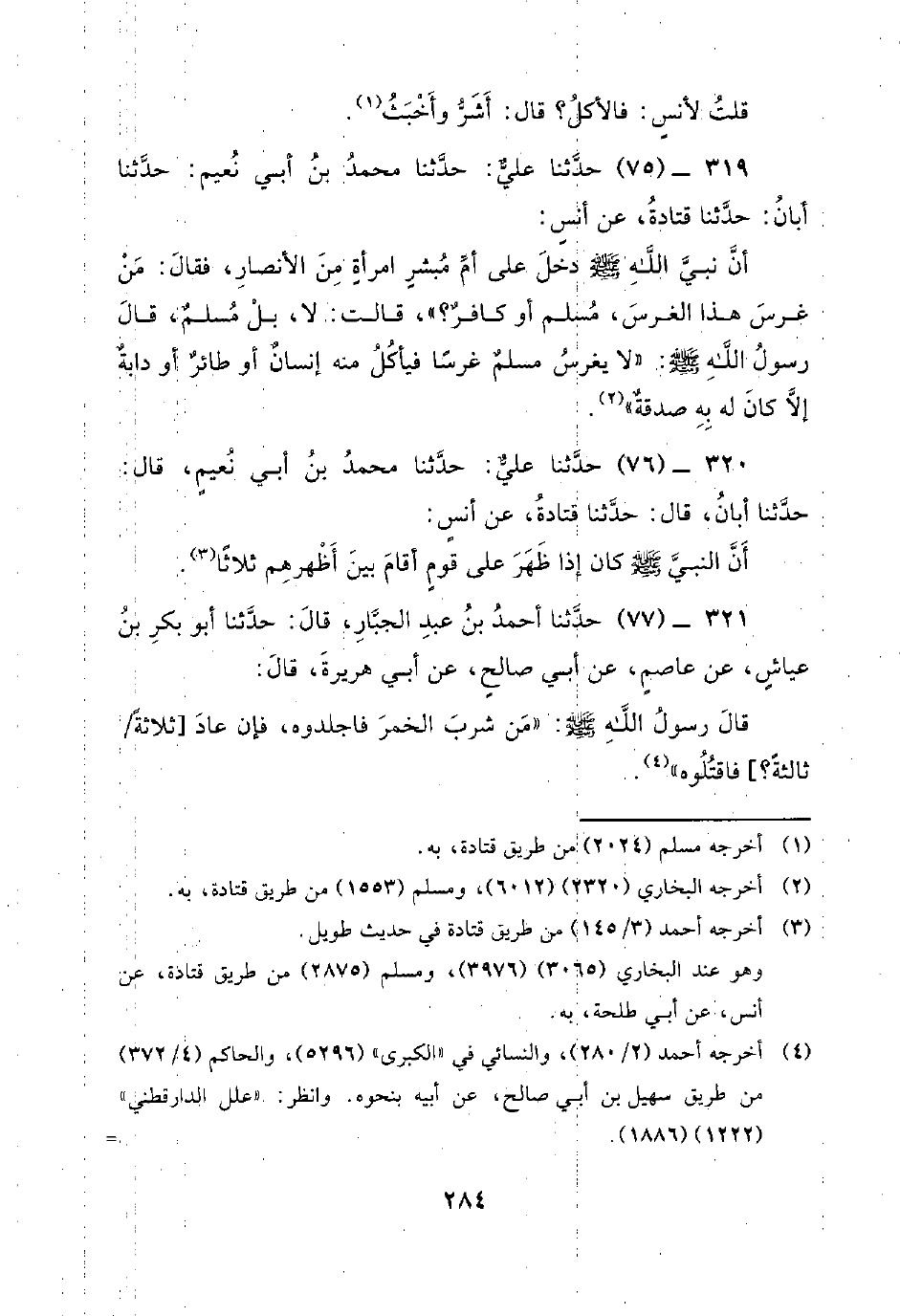 319 - (75) حَدَّثَنَا عَلِيٌّ: حَدَّثَنَا مُحَمَّدُ بْنُ أَبِي نُعَيْمٍ: حَدَّثَنَا أَبَانٌ: حَدَّثَنَا قَتَادَةُ، عَنْ أَنَسٍ: أَنَّ نَبِيَّ اللَّهِ صَلَّى اللَّهُ عَلَيْهِ وَسَلَّمَ دَخَلَ عَلَى أُمِّ مُبَشِّرِ امْرَأَةٍ مِنَ الأَنْصَارِ، فَقَالَ: مَنْ غَرَسَ هَذَا الْغَرْسَ، مُسْلِمٌ أَوْ كَافِرٌ؟، قَالَتْ: لا، بَلْ مُسْلِمٌ، قَالَ رَسُولُ اللَّهِ صَلَّى اللَّهُ عَلَيْهِ وَسَلَّمَ: لا يَغْرِسُ مُسْلِمٌ غَرْسًا فَيَأْكُلُ مِنْهُ إِنْسَانٌ أَوْ طَائِرٌ أَوْ دَابَّةٌ إِلا كَانَ لَهُ بِهِ صَدَقَةٌ.