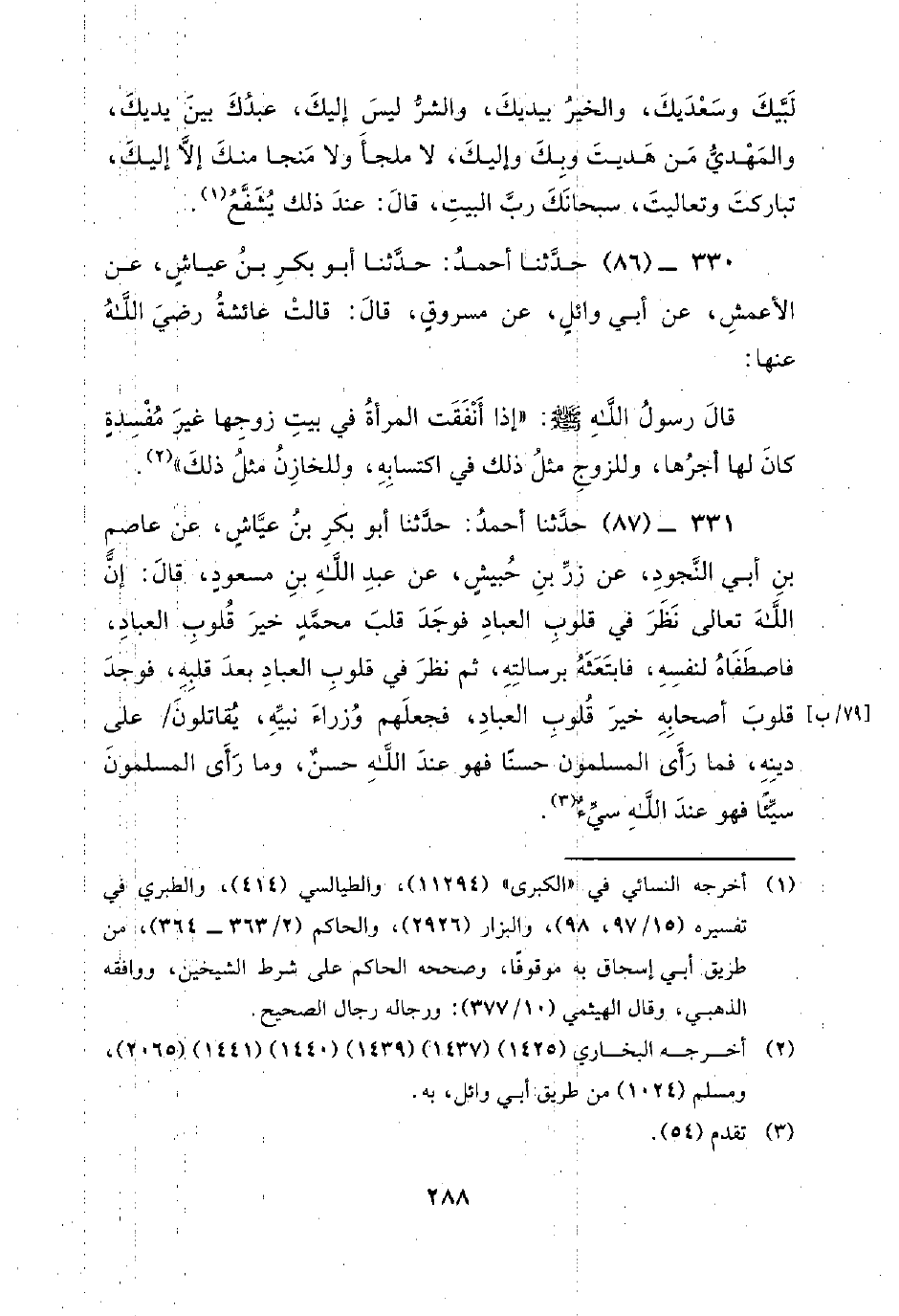 330 - (86) حَدَّثَنَا أَحْمَدُ: حَدَّثَنَا أَبُو بَكْرِ بْنُ عَيَّاشٍ، عن الأعمش، عن أبي وائل، عن مسروق، قَالَ: قَالَتْ عَائِشَةُ رَضِيَ اللَّهُ عَنْهَا: قَالَ رَسُولُ اللَّهِ صَلَّى اللَّهُ عَلَيْهِ وَسَلَّمَ: إِذَا أَنْفَقَتِ الْمَرْأَةُ فِي بَيْتِ زَوْجِهَا غَيْرَ مُفْسِدَةٍ كَانَ لَهَا أَجْرُهَا، وَلِلزَّوْجِ مِثْلَ ذَلِكَ فِي اكْتِسَابِهِ، وَلِلْخَازِنِ مِثْلَ ذَلِكَ.