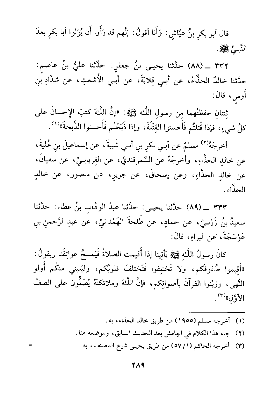 333 - (89) حَدَّثَنَا يَحْيَى: حَدَّثَنَا عَبْدُ الْوَهَّابِ بْنُ عَطَاءٍ: حَدَّثَنَا سَعِيدُ بْنُ زُرْبِيٍّ، عَنْ حَمَّادٍ، عَنْ طَلْحَةَ الْهَمْدَانِيِّ، عَنْ عَبْدِ الرَّحْمَنِ بْنِ عَوْسَجَةَ، عَنِ الْبَرَاءِ، قَالَ: كَانَ رَسُولُ اللَّهِ صَلَّى اللَّهُ عَلَيْهِ وَسَلَّمَ يَأْتِينَا إِذَا أُقِيمَتِ الصَّلاةُ فَيَمْسَحُ عَوَاتِقَنَا وَيَقُولُ: أَقِيمُوا صُفُوفَكُمْ، ولا تختلفوا فتختلف قُلُوبُكُمْ، وَلْيَلِيَنِي مِنْكُمْ أُولُو النُّهَى، وَزَيِنُّوا الْقُرْآنَ بِأَصْوَاتِكُمْ، فَإِنَّ اللَّهَ وَمَلائِكَتَهُ يُصَلُّونَ عَلَى الصف الأول.
