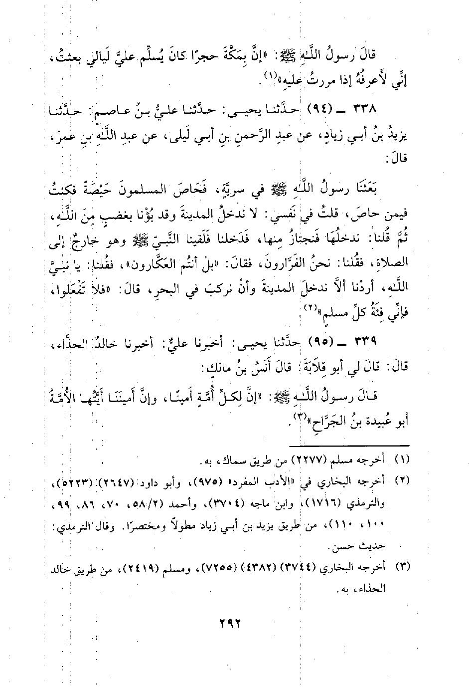 339 - (95) حَدَّثَنَا يَحْيَى: أَخْبَرَنَا عَلِيٌّ: أَخْبَرَنَا خَالِدٌ الْحَذَّاءُ، قَالَ: قَالَ لِي أَبُو قِلابَةَ: قَالَ أَنَسِ بْنِ مَالِكٍ: قَالَ رَسُولُ اللَّهِ صَلَّى اللَّهُ عَلَيْهِ وَسَلَّمَ: إِنَّ لِكُلِّ أُمَّةٍ أَمِينًا، وَإِنَّ أَمِينَنَا أَيَّتُهَا الأُمَّةُ أَبُو عُبَيْدَةَ بْنُ الْجَرَّاحِ.