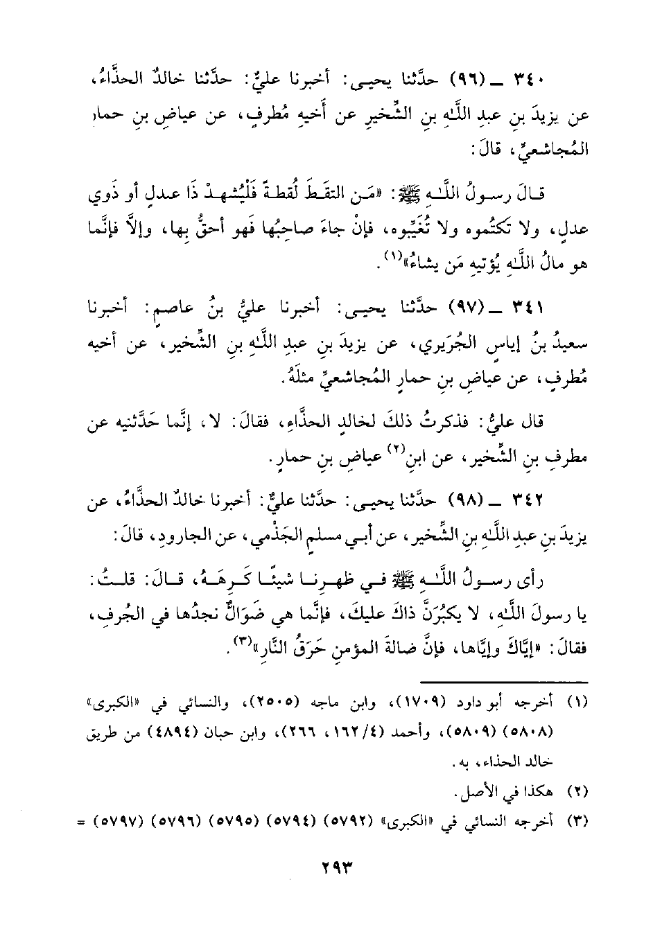 342 - (98) حَدَّثَنَا يَحْيَى: حَدَّثَنَا عَلِيٌّ: أَخْبَرَنَا خَالِدٌ الْحَذَّاءُ، عن يزيد بن عبد الله بن الشخير، عَنْ أَبِي مُسْلِمٍ الْجَذَمِيِّ، عَنِ الْجَارُودِ، قَالَ: رَأَى رَسُولَ اللَّهِ صَلَّى اللَّهُ عَلَيْهِ وَسَلَّمَ فِي ظَهْرِنَا شَيْئًا كَرِهَهُ، قَالَ: قُلْتُ: يَا رَسُولَ اللَّهِ، لا يَكْبُرَنَّ ذَاكَ عَلَيْكَ، فَإِنَّمَا هِيَ ضَوَالٌّ نَجِدُهَا فِي الْجَرْفِ، فَقَالَ: إِيَّاكَ وَإِيَّاهَا، فَإِنَّ ضَالَّةَ الْمُؤْمِنِ حَرْقُ النَّارِ.