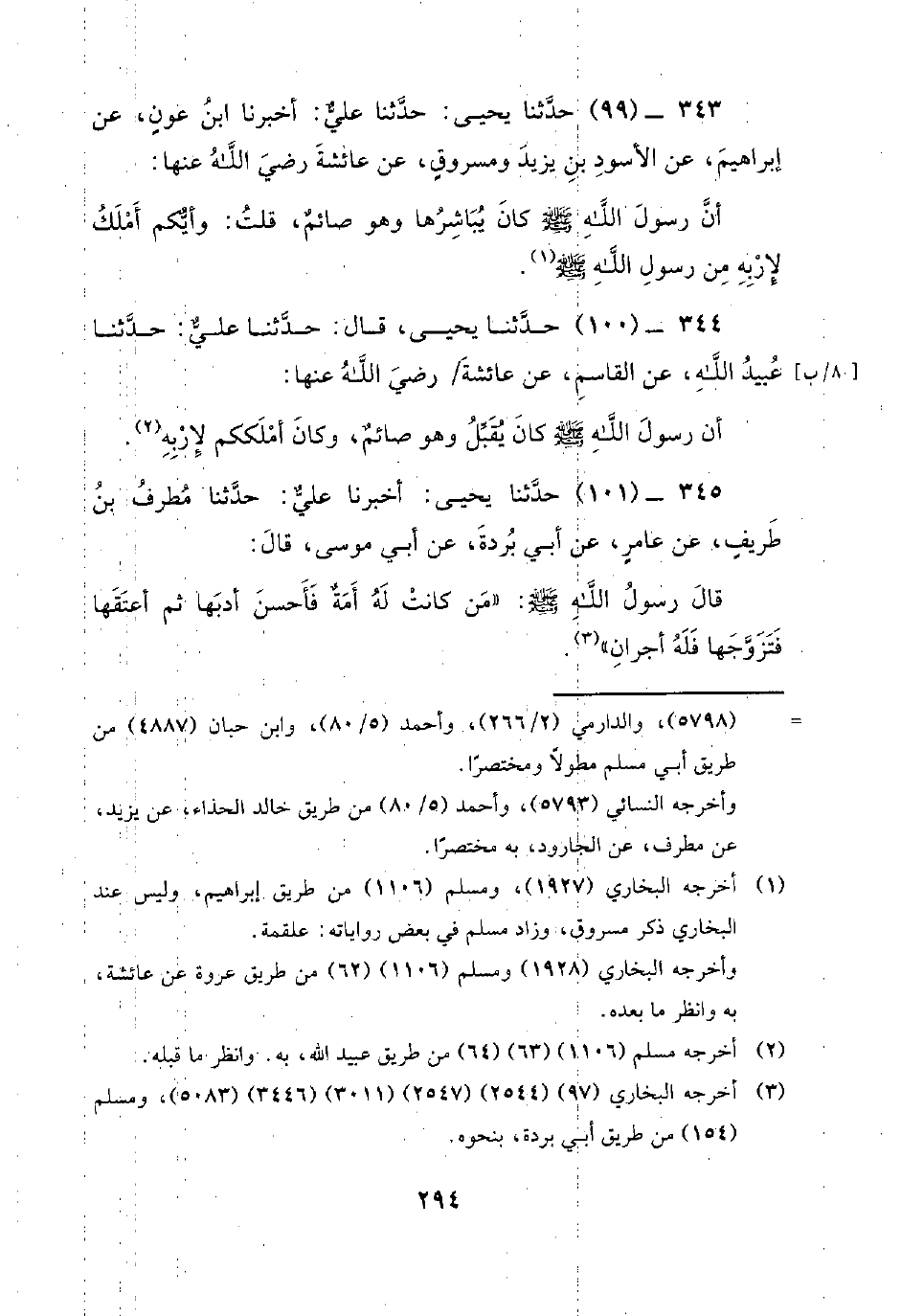 343 - (99) حدثنا يحيى: أخبرنا عَلِيٌّ: أَخْبَرَنَا ابْنُ عَوْنٍ، عَنْ إِبْرَاهِيمَ، عَنِ الأَسْوَدِ بْنِ يَزِيدَ وَمَسْرُوقٌ، عَنْ عَائِشَةَ رَضِيَ اللَّهُ عَنْهَا: أَنَّ رَسُولَ اللَّهِ صَلَّى اللَّهُ عَلَيْهِ وَسَلَّمَ كَانَ يُبَاشِرُهَا وَهُوَ صَائِمٌ، قُلْتُ: وَأَيُّكُمْ أَمْلُكُ لإِرْبِهِ مِنْ رَسُولِ اللَّهِ صَلَّى اللَّهُ عَلَيْهِ وَسَلَّمَ.