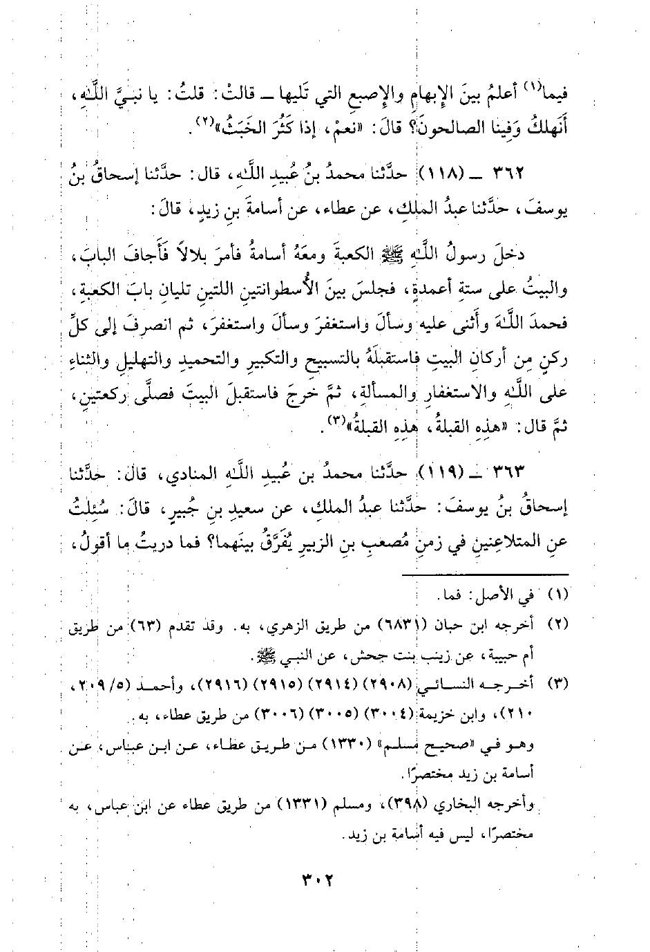 362 - (118) حَدَّثَنَا مُحَمَّدُ بْنُ عُبَيْدِ اللَّهِ، قَالَ: حَدَّثَنَا إِسْحَاقُ بْنُ يُوسُفَ، حَدَّثَنَا عَبْدُ الْمَلِكِ، عَنْ عَطَاءٍ، عَنْ أُسَامَةَ بْنِ زَيْدٍ، قَالَ: دَخَلَ رَسُولُ اللَّهِ صَلَّى اللَّهُ عَلَيْهِ وَسَلَّمَ الْكَعْبَةَ وَمَعَهُ أُسَامَةُ فَأَمَرَ بِلالا فَأَجَافَ الْبَابَ، وَالْبَيْتُ عَلَى سِتَّةِ أَعْمِدَةٍ، فَجَلَسَ بَيْنَ الأُسْطَوَانَتَيْنِ اللَّتَيْنِ تَلِيَانِ بَابَ الْكَعْبَةِ، فَحَمِدَ اللَّهَ وَأَثْنَى عَلَيْهِ وَسَأَلَ وَاسْتَغْفَرَ وَسَأَلَ وَاسْتَغْفَرَ، ثُمَّ انْصَرَفَ إِلَى كُلِّ رُكْنٍ مِنْ أَرْكَانِ الْبَيْتِ فَاسْتَقْبَلَهُ بِالتَّسْبِيحِ وَالتَّكْبِيرِ وَالتَّحْمِيدِ وَالتَّهْلِيلِ وَالثَّنَاءِ عَلَى اللَّهِ وَالاسْتِغْفَارِ وَالْمَسْأَلَةِ، ثُمَّ خَرَجَ فَاسْتَقْبَلَ الْبَيْتَ فَصَلَّى رَكْعَتَيْنِ، ثُمَّ قَالَ: هَذِهِ الْقِبْلَةُ، هَذِهِ الْقِبْلَةُ.