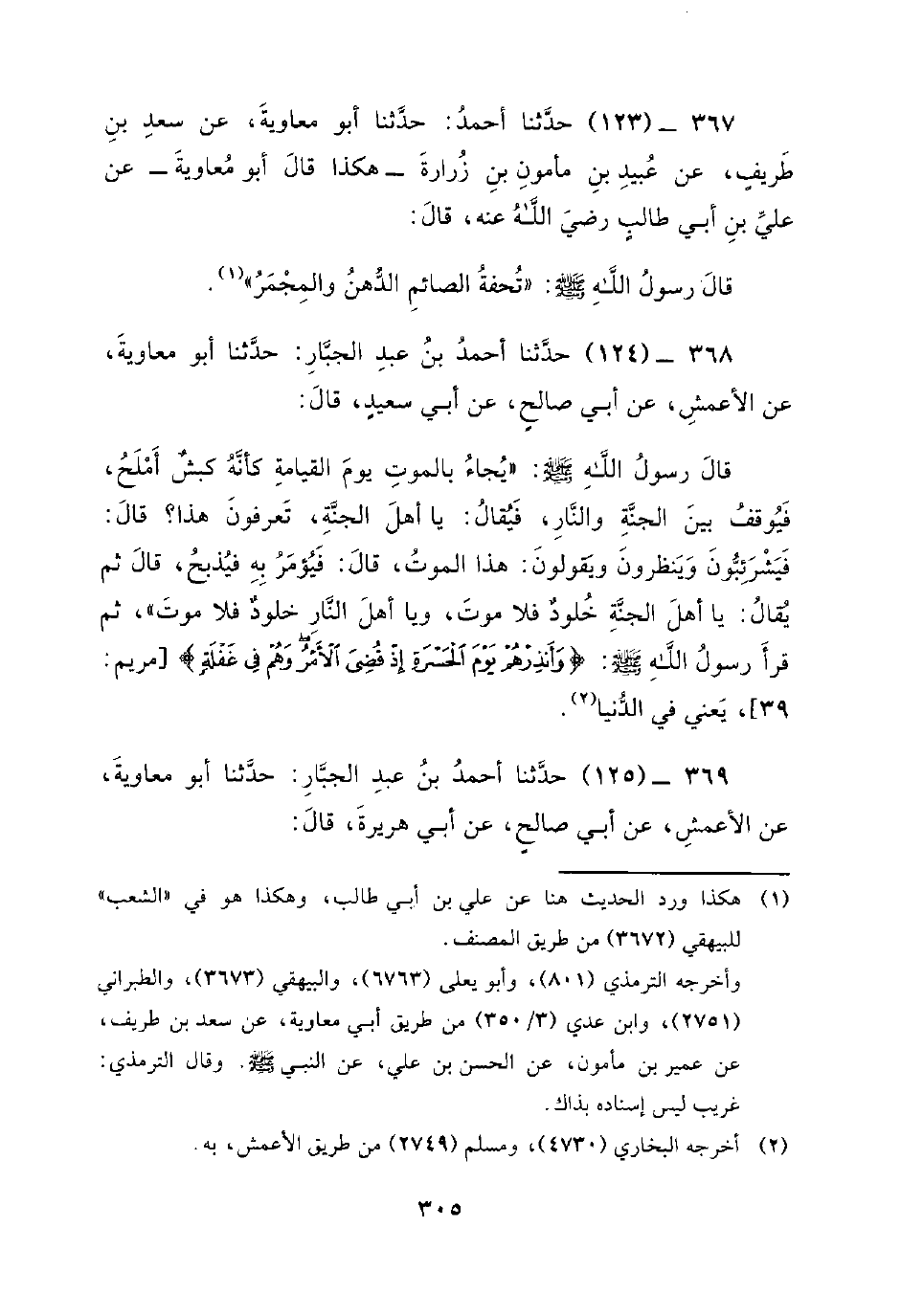 368 - (124) حَدَّثَنَا أَحْمَدُ بْنُ عَبْدِ الْجَبَّارِ: حَدَّثَنَا أَبُو معاوية، عن الأعمش، عن أبي صالح، عن أَبِي سَعِيدٍ، قَالَ: قَالَ رَسُولُ اللَّهِ صَلَّى اللَّهُ عَلَيْهِ وَسَلَّمَ: يُجَاءُ بِالْمَوْتِ يَوْمَ الْقِيَامَةِ كَأَنَّهُ كَبْشٌ أَمْلَحُ، فَيُوقَفُ بَيْنَ الْجَنَّةِ وَالنَّارِ، فَيُقَالُ: يَا أَهْلَ الْجَنَّةِ، تَعْرِفُونَ هَذَا؟ قَالَ: فَيَشْرَئِبُّونَ وَيَنْظُرُونَ وَيَقُولُونَ: هَذَا الْمَوْتُ، قَالَ: فَيُؤْمَرُ بِهِ فَيُذْبَحُ، قَالَ ثُمَّ يُقَالُ: يَا أَهْلَ الْجَنَّةِ خُلُودٌ فَلا مَوْتٌ، وَيَا أَهْلَ النَّارِ خلود فلا موت، ثم قرأ رسول الله صَلَّى اللَّهُ عَلَيْهِ وَسَلَّمَ: {وَأَنْذِرْهُمْ يَوْمَ الْحَسْرَةِ إذ قضى الأمر وهم في غفلة} يَعْنِي فِي الدُّنْيَا.
