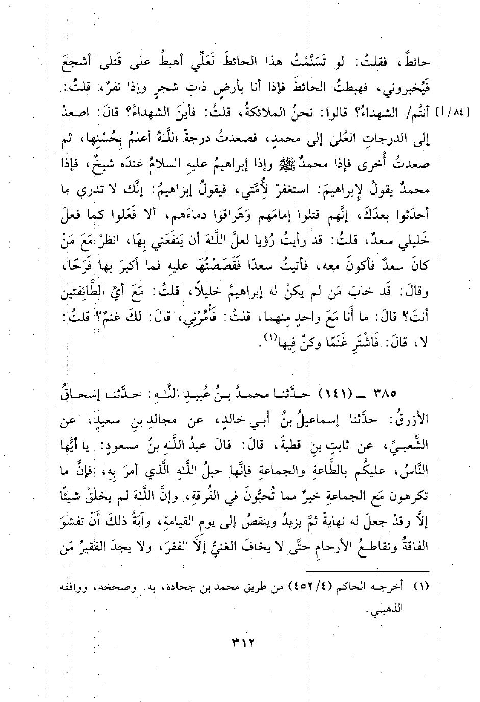385 - (141) حَدَّثَنَا مُحَمَّدُ بْنُ عُبَيْدِ اللَّهِ: حَدَّثَنَا إِسْحَاقُ الأَزْرَقُ: حَدَّثَنَا إِسْمَاعِيلُ بْنُ أَبِي خَالِدٍ، عَنْ مُجَالِدِ بْنِ سَعِيدٍ، عَنِ الشَّعْبِيِّ، عَنْ ثَابِتِ بْنِ قُطْبَةَ، قَالَ: قَالَ عَبْدُ اللَّهِ بْنُ مَسْعُودٍ: يَا أَيُّهَا النَّاسُ، عَلَيْكُمْ بِالطَّاعَةِ وَالْجَمَاعَةِ فَإِنَّهَا حَبْلُ اللَّهِ الذي أمر به، فإن ما تكرهون في الْجَمَاعَةِ خَيْرٌ مِمَّا تُحِبُّونَ فِي الْفُرْقَةِ، وَإِنَّ اللَّهَ لَمْ يَخْلُقْ شَيْئًا إِلا وَقَدْ جَعَلَ لَهُ نِهَايَةً ثُمَّ يَزِيدُ وَيَنْقُصُ إِلَى يَوْمِ الْقِيَامَةِ، وَآيَةُ ذَلِكَ أَنْ تَفْشُوَ الْفَاقَةُ وَتَقَاطَعُ الأَرْحَامُ حَتَّى لا يَخَافُ الْغَنِيُّ إِلا الْفَقْرَ، وَلا يَجِدُ الْفَقِيرُ مَنْ -[313]- يَعْطِفُ عَلَيْهِ بِشَيْءٍ، حَتَّى إِنَّ السَّائِلَ يَسْأَلُ بَيْنَ الْجُمُعَتَيْنِ مَا يَقَعُ فِي كَفِّهِ شَيْءٌ، فَبَيْنَا هُمْ كَذَلِكَ إِذْ فَجَئَتْهُمُ الأَرْضُ تَخُورُ خُوَارَ الثَّوْرِ لا يَرَى كُلُّ قَوْمٍ إِلا أَنَّهَا خَارَتْ مِنْ سَاحَتِهِمْ، فَيَفْزَعُونَ ثُمَّ يَرْجِعُونَ فَيَمْكُثُونَ مَا شَاءَ اللَّهُ إِذْ فَجَئَتْهُمْ تَقِيءُ أَفْلاذُ كَبِدِهَا - وَأَشَارَ إِلَى أَسَاطِينِ الْمَسْجِدِ - فَقَالَ: أَمْثَالُ هَذِهِ الأَسَاطِينُ مِنَ الذَّهَبِ وَالْفِضَّةِ، فَيَوْمَئِذٍ لا ينفع ذهب ولا فضة.