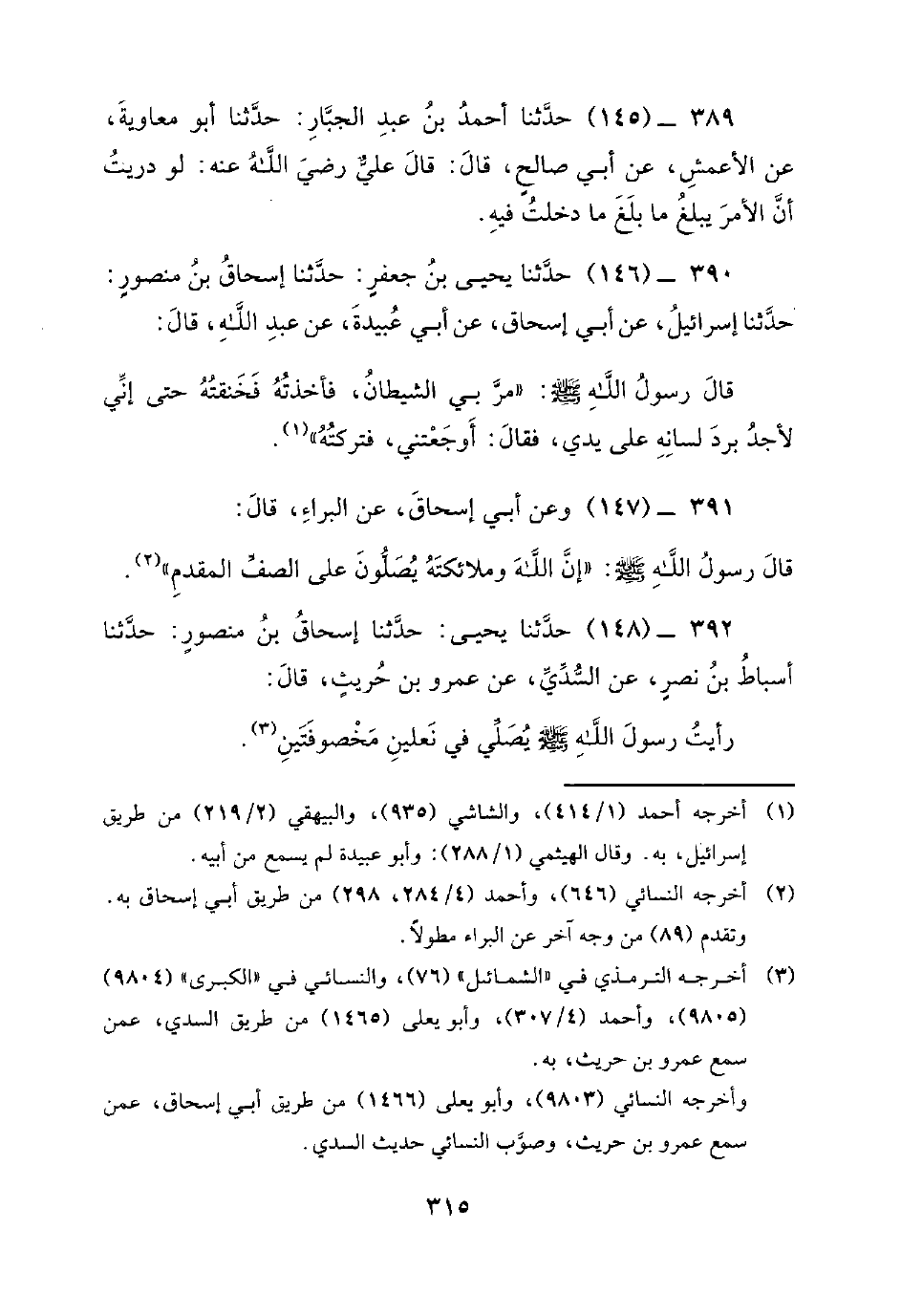 392 - (148) حَدَّثَنَا يَحْيَى: حَدَّثَنَا إِسْحَاقُ بْنُ مَنْصُورٍ: حَدَّثَنَا أَسْبَاطُ بْنُ نَصْرٍ، عَنِ السُّدِّيِّ، عَنْ عَمْرِو بْنِ حُرَيْثٍ، قَالَ: رَأَيْتُ رَسُولَ اللَّهِ صَلَّى اللَّهُ عَلَيْهِ وَسَلَّمَ يُصَلِّي فِي نَعْلَيْنِ مَخْصُوفَتَيْنِ.