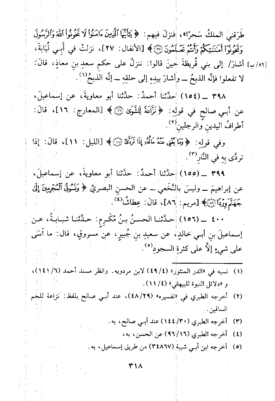398 - (154) حدثنا أحمد: حدثنا أبو معاوية، عن إسماعيل، عن أبي صالح في قوله: {نَزَّاعَةً لِلشَّوَى}، قال: أطراف اليدين والرجلين. وفي قوله: {وَمَا يغني عنه ماله إذا تردى}، قال: إذا تردى به في النار.