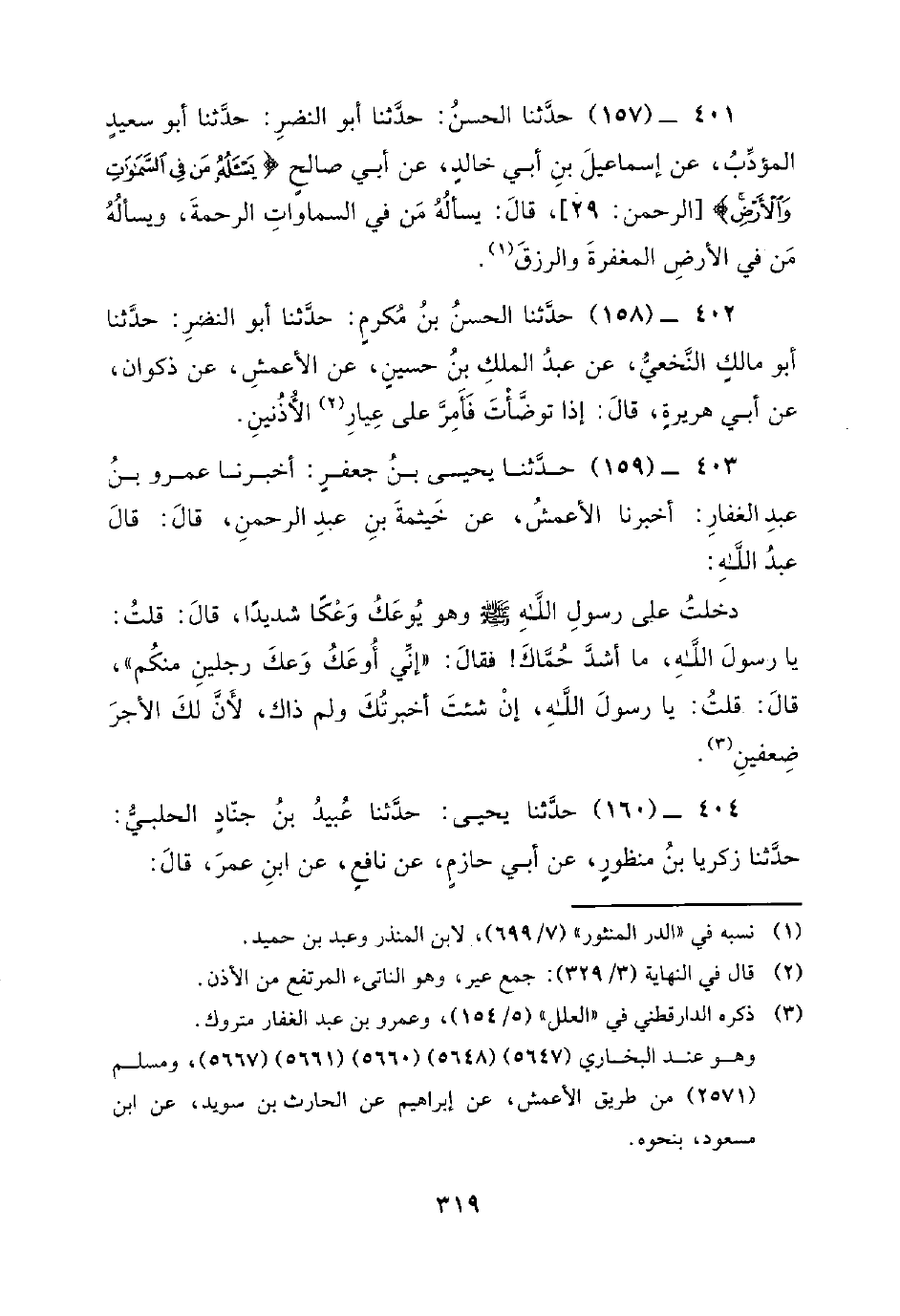 401 - (157) حَدَّثَنَا الْحَسَنُ: حَدَّثَنَا أَبُو النَّضْرِ: حَدَّثَنَا أَبُو سعيد المؤدب، عن إسماعيل بن أبي خالد، عن أبي صالح: {يسئله من في السماوات والأرض}، قال: يسأله من في السماوات الرحمة، ويسأله مَنْ فِي الأَرْضِ الْمَغْفِرَةَ وَالرِّزْقَ.