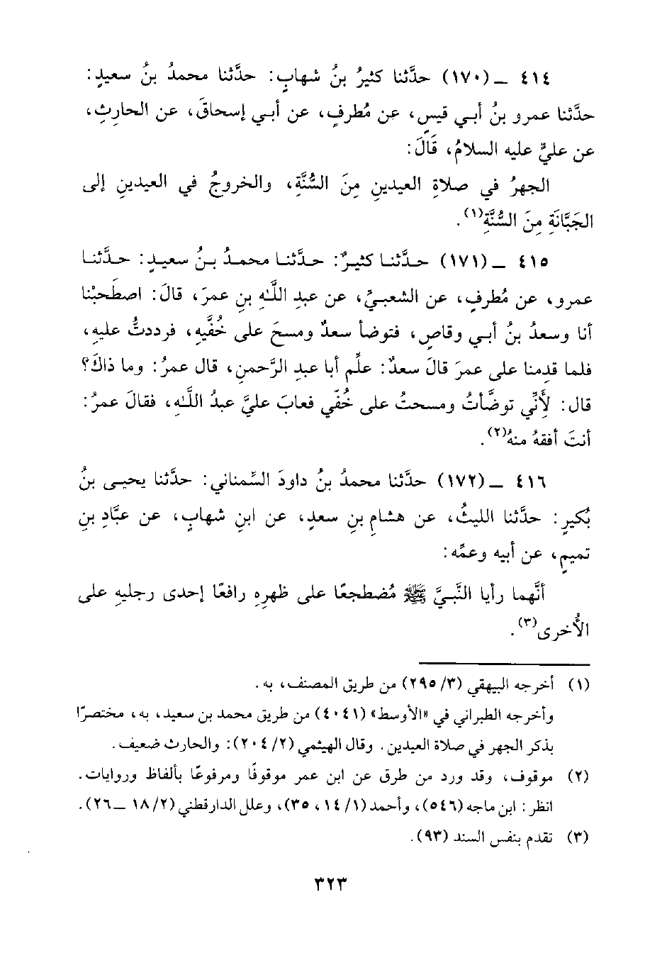 414 - (170) حَدَّثَنَا كَثِيرُ بْنُ شِهَابٍ: حَدَّثَنَا مُحَمَّدُ بْنُ سعيد: حَدَّثَنَا عَمْرُو بْنُ أَبِي قَيْسٍ، عَنْ مُطَرِّفٍ، عَنْ أَبِي إِسْحَاقَ، عَنِ الْحَارِثِ، عَنْ عَلِيٍّ عَلَيْهِ السَّلامُ، قَالَ، الْجَهْرُ فِي صَلاةِ الْعِيدَيْنِ مِنَ السُّنَّةِ، وَالْخُرُوجُ فِي الْعِيدَيْنِ إِلَى الْجَبَّانَةِ من السنة.