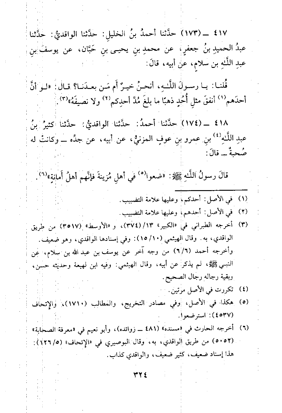 417 - (173) حَدَّثَنَا أَحْمَدُ بْنُ الْخَلِيلِ: حَدَّثَنَا الْوَاقِدِيُّ: حَدَّثَنَا عَبْدُ الْحَمِيدِ بْنُ جَعْفَرٍ، عَنْ مُحَمَّدِ بْنِ يَحْيَى بْنِ حِبَّانَ، عَنْ يُوسُفَ بْنِ عَبْدِ اللَّهِ بْنِ سَلامٍ، عَنْ أَبِيهِ، قَالَ: قُلْنَا: يَا رَسُولَ اللَّهِ، أَنَحْنُ خَيْرٌ أَمْ مَنْ بَعْدَنَا؟ قَالَ: لَوْ أَنَّ أَحَدَهُمْ أَنْفَقَ مِثْلَ أُحُدٍ ذَهَبًا مَا بَلَغَ مَدَّ أَحَدِكُمْ وَلا نصيفه.