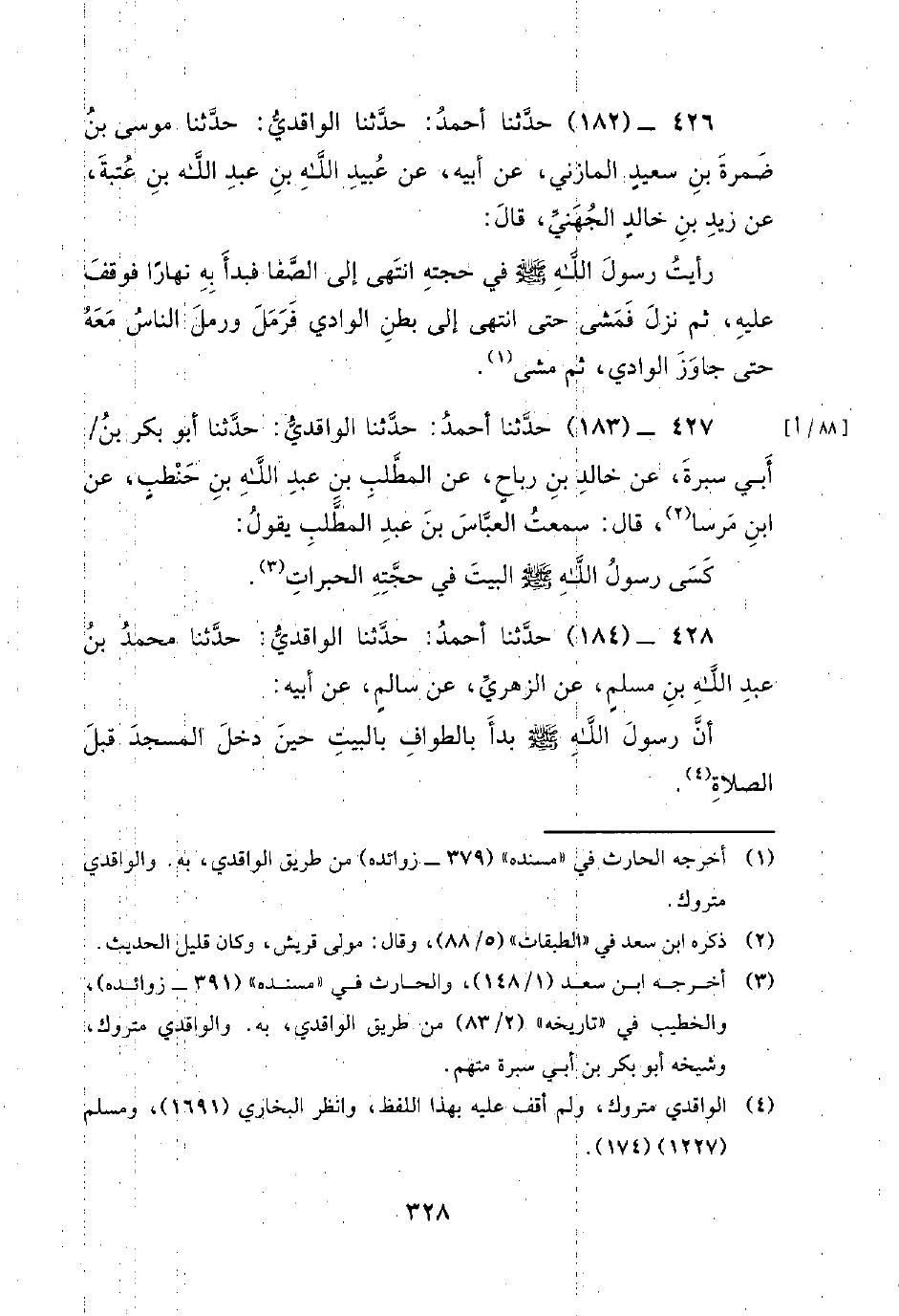 426 - (182) حَدَّثَنَا أَحْمَدُ: حَدَّثَنَا الْوَاقِدِيُّ: حَدَّثَنَا مُوسَى بْنُ ضَمْرَةَ بْنِ سَعِيدٍ الْمَازِنِيُّ، عَنْ أَبِيهِ، عَنْ عُبَيْدِ اللَّهِ بْنِ عَبْدِ اللَّهِ بْنِ عُتْبَةَ، عَنْ زَيْدِ بْنِ خَالِدٍ الْجُهَنِيِّ، قَالَ: رَأَيْتُ رسول الله صلى الله عليه وسلم في حجته انتهى إلى الصفا فبدأ به نهاراً فَوَقَفَ عَلَيْهِ، ثُمَّ نَزَلَ فَمَشَى حَتَّى انْتَهَى إِلَى بَطْنِ الْوَادِي فَرَمَلَ وَرَمَلَ النَّاسُ مَعَهُ حَتَّى جَاوَزَ الْوَادِي، ثُمَّ مَشَى.