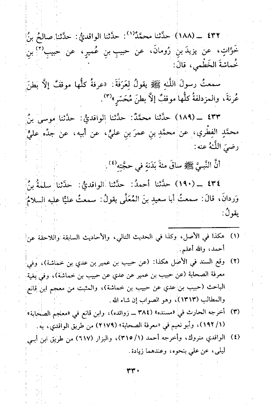 432 - (188) حَدَّثَنَا مُحَمَّدٌ: حَدَّثَنَا الْوَاقِدِيُّ: حَدَّثَنَا صَالِحُ بْنُ خَوَّاتٍ، عَنْ يَزِيدَ بْنِ رُومَانَ، عَنْ حَبِيبِ بْنِ عُمَيْرٍ، عَنْ حَبِيبِ بْنِ خماشة الْخَطْمِيِّ، قَالَ: سَمِعْتُ رَسُولَ اللَّهِ صَلَّى اللَّهُ عَلَيْهِ وَسَلَّمَ يَقُولُ لِعَرَفَةَ: عَرَفَةُ كُلُّهَا مَوْقِفٌ إِلا بَطْنُ عَرْنَةَ، وَالْمُزْدَلِفَةُ كُلُّهَا مَوْقِفٌ إِلا بَطْنَ محسر.