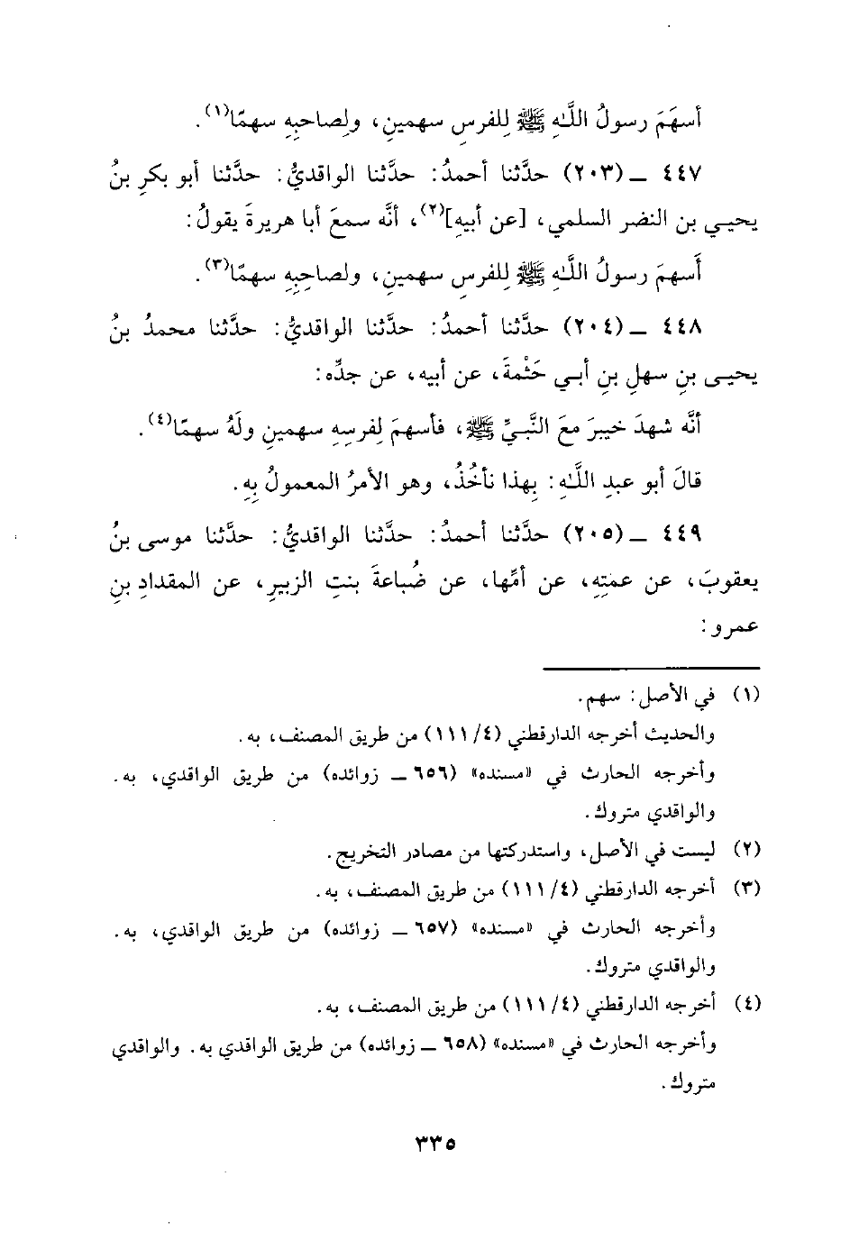 449 - (205) حَدَّثَنَا أَحْمَدُ: حَدَّثَنَا الْوَاقِدِيُّ: حَدَّثَنَا مُوسَى بْنُ يَعْقُوبَ، عَنْ عَمَّتِهِ، عَنْ أُمِّهَا، عَنْ ضُبَاعَةَ بِنْتِ الزُّبَيْرِ، عَنِ الْمِقْدَادِ بْنِ عَمْرٍو: -[336]- أَنَّهُ ضَرَبَ لَهُ رَسُولُ اللَّهِ صَلَّى اللَّهُ عَلَيْهِ وَسَلَّمَ يَوْمَ بَدْرٍ سَهْمَيْنِ، لِفَرَسِهِ سَهْمٌ وَلَهُ سَهْمٌ. قَالَ أَبُو عَبْدِ اللَّهِ: هَذَا قَوْلُ مَالِكٍ وَقَوْلُ أَبِي حَنِيفَةَ.