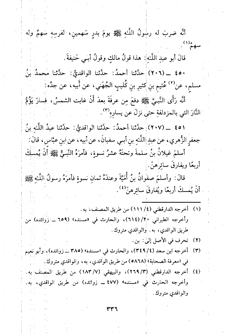 451 - (207) حَدَّثَنَا أَحْمَدُ: حَدَّثَنَا الْوَاقِدِيُّ: حَدَّثَنَا عَبْدُ اللَّهِ بْنُ جَعْفَرٍ الزُّهْرِيُّ، عَنْ عَبْدِ اللَّهِ بْنِ أَبِي سُفْيَانَ، عَنْ أَبِيهِ، عَنِ ابْنِ عَبَّاسٍ، قَالَ: أَسْلَمَ غَيْلانُ بْنُ سَلَمَةَ وَتَحْتَهُ عَشْرُ نِسْوَةٍ، فَأَمَرَهُ النَّبِيُّ صَلَّى اللَّهُ عَلَيْهِ وَسَلَّمَ أَنْ يُمْسِكَ أَرْبَعًا وَيُفَارِقَ سَائِرَهُنَّ. قَالَ: وَأَسْلَمَ صَفْوَانُ بْنُ أُمَيَّةَ وَعِنْدَهُ ثَمَانِ نِسْوَةٍ فَأَمَرَهُ رسول الله إِنَّ يُمْسِكَ أَرْبَعًا ويفارق سائرهن.
