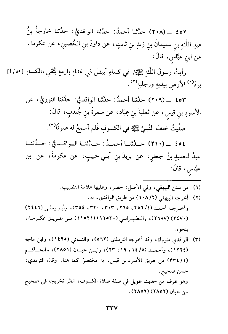 452 - (208) حَدَّثَنَا أَحْمَدُ: حَدَّثَنَا الْوَاقِدِيُّ: حَدَّثَنَا خَارِجَةُ بْنُ عَبْدِ اللَّهِ بْنِ سُلَيْمَانَ بْنِ زَيْدِ بْنِ ثَابِتٍ، عَنْ دَاوُدَ بْنِ الْحُصَيْنِ، عَنْ عِكْرِمَةَ؛ عَنِ ابْنِ عَبَّاسٍ، قَالَ: رَأَيْتُ رَسُولَ اللَّهِ صَلَّى اللَّهُ عَلَيْهِ وَسَلَّمَ / فِي كِسَاءٍ أَبْيَضَ فِي غَدَاةٍ بَارِدَةٍ يَتَّقِي بِالْكِسَاءِ بَرْدَ الأَرْضِ بيديه ورجليه.