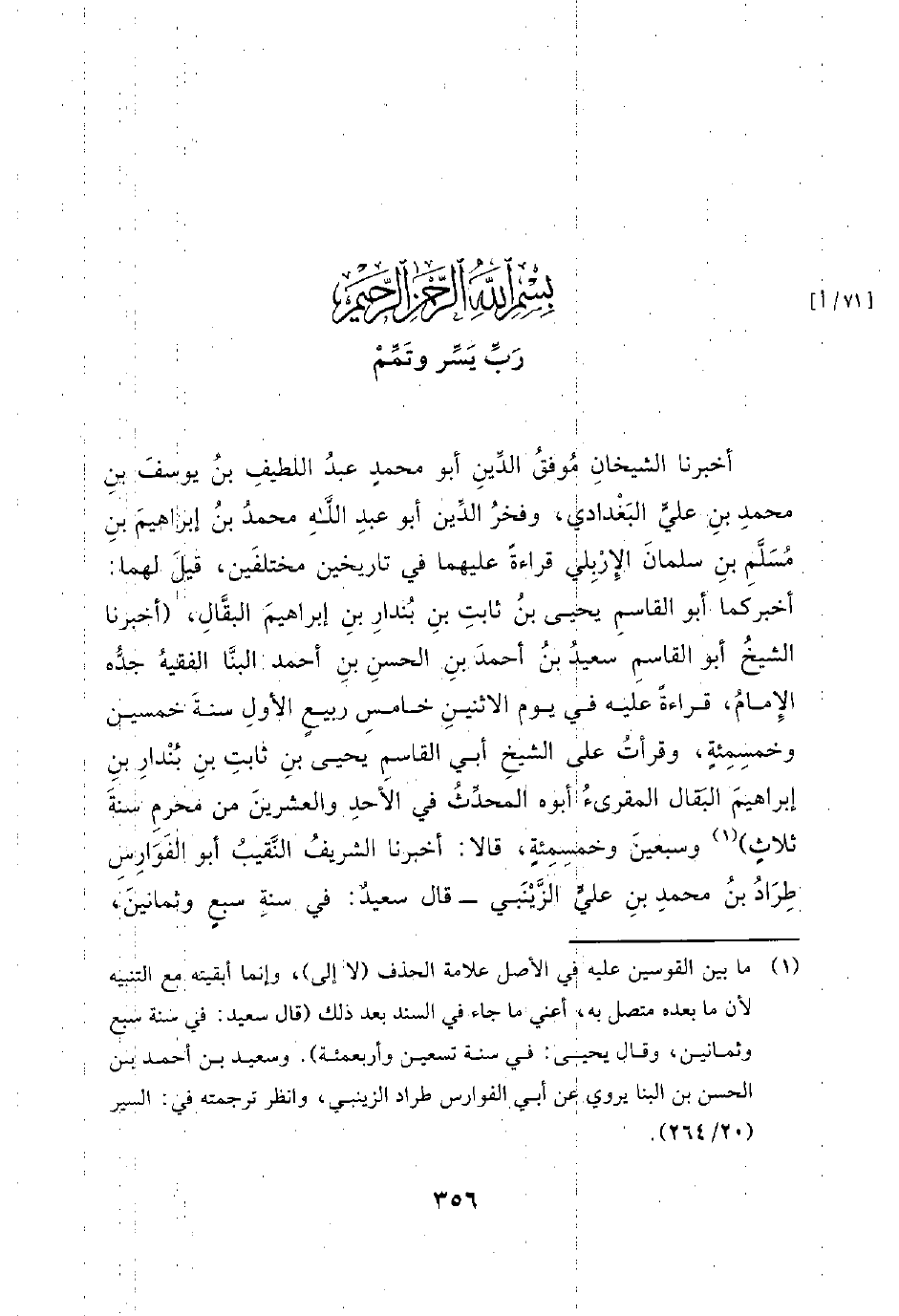 أخبرنا الشيخان موفق الدين أبو محمد عبد اللطيف بن يوسف بن محمد بن علي البغدادي، وفخر الدين أبو عَبْدِ اللَّهِ مُحَمَّدِ بن إبراهيم بن مسلم بن سلمان الإربلي قراءة عليهما في تاريخين مختلفين، قيل لهما: أخبركما الشيخ أبو القاسم يحيى بن ثابت بن بندار بن إبراهيم البقال، أخبرنا الشيخ أبو القاسم سعيد بن أحمد بن الحسن بن أحمد البنا الفقيه جده الإمام، قراءة عليه في يوم الاثنين خامس ربيع الأول سنة خمسين وخمسمئة، وقرأت على الشيخ أبي القاسم يحيى بن ثابت بن بندار بن إبراهيم البقال المقرئ أبوه المحدث في الأحد والعشرين من محرم سنة ثلاث وسبعين وخمسمئة، قالا: أخبرنا الشريف النقيب أبو الْفَوَارِسِ طِرَادِ بْن مُحَمَّد بْن عَلِي الزَّيْنَبِيِّ قال سعيد: في سنة سبع وثمانين، -[357]- وقال يحيى: في سنة تسعين وأربعمئة قَالَ: أَخْبَرَنَا أَبُو الْحُسَيْنِ عَلِيُّ بْنُ مُحَمَّدِ بْنِ عَبْدِ اللَّهِ بن بشران قراءة عليه في المحرم سَنَةِ اثْنَتَيْ عَشْرَةَ وَأَرْبَعِمِائَةٍ قَالَ: أَخْبَرَنَا أَبُو جَعْفَرٍ مُحَمَّدُ بْنُ عَمْرِو بْنِ الْبَخْتَرِيِّ الرَّزَّازِ في شهر رمضان سنة تسع وَثَلاثِينَ وَثَلاثِمِائَةٍ، قَالَ:
