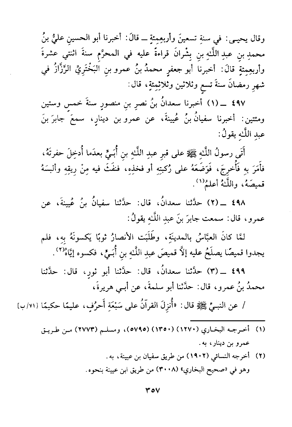 498 - (2) حَدَّثَنَا سَعْدَانُ، قَالَ: حَدَّثَنَا سُفْيَانُ بْنُ عُيَيْنَةَ، عَنْ عَمْرِو، قَالَ: سَمِعْتُ جَابِرَ بْنَ عَبْدِ اللَّهِ يَقُولُ لَمَّا كَانَ الْعَبَّاسُ بِالْمَدِينَةِ، وَطَلَبَتِ الأَنْصَارُ ثَوْبًا يَكْسُونَهُ بِهِ، فَلَمْ يَجِدُوا قَمِيصًا يَصْلُحُ عَلَيْهِ إِلا قَمِيصَ عَبْدِ اللَّهِ بْنِ أُبَيٍّ، فَكَسَوْهُ إِيَّاهُ.