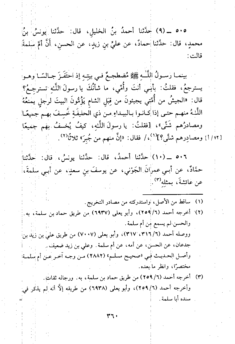 505 - (9) حدثنا أحمد بن خليل، قَالَ: حَدَّثَنَا يُونُسُ بْنُ مُحَمَّدٍ، قَالَ: حَدَّثَنَا حَمَّادٌ، عَنْ عَلِيِّ بْنِ زَيْدٍ، عَنِ الْحَسَنِ، أَنَّ أُمَّ سَلَمَةَ قَالَتْ: بَيْنَمَا رَسُولُ اللَّهِ صَلَّى اللَّهُ عَلَيْهِ وَسَلَّمَ مُضْطَجِعٌ فِي بَيْتِهِ إِذِ احْتَفَزَ جَالِسًا وَهُوَ يَسْتَرْجِعُ، فَقُلْتُ: بِأَبِي أَنْتَ وَأُمِّي، مَا شَأْنُكَ يَا رَسُولَ اللَّهِ تَسْتَرْجِعُ؟ قَالَ: الْجَيْشُ مِنْ أُمَّتِي يَجِيئُونَ مِنْ قِبَلِ الشَّامِ يَؤُمُّونَ الْبَيْتَ لِرَجُلٍ يَمْنَعُهُ اللَّهُ مِنْهُمْ حَتَّى إِذَا كَانُوا بِالْبَيْدَاءِ مِنْ ذِي الْحُلَيْفَةِ خُسِفَ بِهِمْ جَمِيعًا وَمَصَادِرُهُمْ شَتَّى، [فَقُلْتُ: يَا رَسُولَ اللَّهِ، كَيْفَ يُخْسَفُ بِهِمْ جَمِيعًا وَمَصَادِرُهُمْ شَتَّى؟] / فَقَالَ: إِنَّ مِنْهُمْ مَنْ جَبَرَ ثَلاثًا.