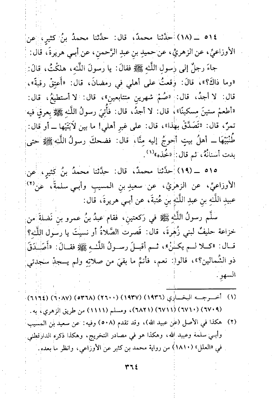 515 - (19) حدثنا محمد، قال: حدثنا محمد بن كثير، عَنِ الأَوْزَاعِيِّ، عَنِ الزُّهْرِيِّ، عَنْ سَعِيدِ بْنِ الْمُسَيِّبِ وَأَبِي سلمة، عَنْ عُبَيْدِ اللَّهِ بْنِ عَبْدِ اللَّهِ بْنِ عُتْبَةَ، عَنْ أَبِي هُرَيْرَةَ، قَالَ: سَلَّمَ رَسُولِ اللَّهِ صَلَّى اللَّهُ عَلَيْهِ وَسَلَّمَ فِي رَكْعَتَيْنِ، فَقَامَ عَبْدُ بْنُ عَمْرِو بْنِ نَضْلَةَ مِنْ خُزَاعَةَ حَلِيفٌ لِبَنِي زُهْرَةَ، قَالَ: قُصِرَتِ الصَّلاةُ أَوْ نَسِيتَ يَا رَسُولَ اللَّهِ؟ قَالَ: كَلا لَمْ يَكُنْ، ثُمَّ أَقْبَلَ رَسُولِ اللَّهِ صَلَّى اللَّهُ عَلَيْهِ وَسَلَّمَ فَقَالَ: صدق ذُو الشِّمَالَيْنِ؟، قَالُوا: نَعَمْ، فَأَتَمَّ مَا بَقِيَ من صلاته ولم يسجد سجدتي السهو.