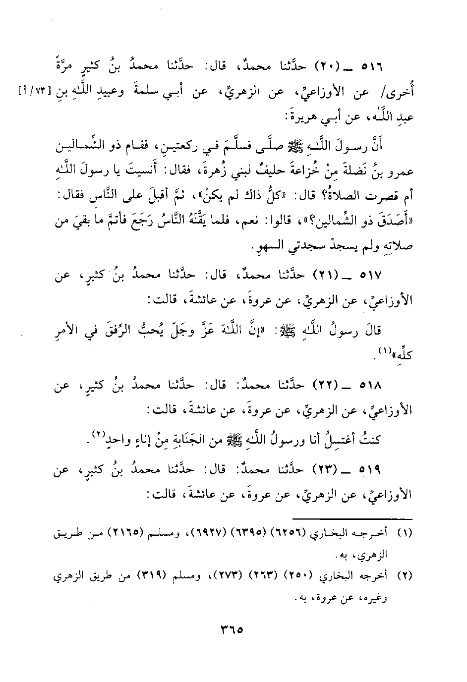 516 - (20) حدثنا محمد، قال: حدثنا محمد بن كثير مَرَّةً أُخْرَى / عَنِ الأَوْزَاعِيِّ، عَنِ الزُّهْرِيِّ، عَنْ أَبِي سَلَمَةَ وَعُبَيْدِ اللَّهِ بْنِ عَبْدِ اللَّهِ، عن أبي هريرة: أن رسول الله صلى اللَّهُ عَلَيْهِ وَسَلَّمَ صَلَّى فَسَلَّمَ فِي رَكْعَتَيْنِ، فَقَامَ ذُو الشِّمَالَيْنِ عَمْرِو بْنِ نَضْلَةَ مِنْ خُزَاعَةَ حَلِيفٌ لِبَنِي زُهْرَةَ، فَقَالَ: أَنَسِيتَ يَا رَسُولَ اللَّهِ أَمْ قُصِرَتِ الصَّلاةُ؟ قَالَ: كُلُّ ذَاكَ لَمْ يَكُنْ، ثُمَّ أَقْبَلَ عَلَى النَّاسِ فَقَالَ: أَصَدَقَ ذُو الشِّمَالَيْنِ؟، قَالُوا: نَعَمْ، فلمَّا يَقَّنَهُ النَّاسُ رَجَعَ فَأَتَمَّ مَا بَقِيَ مِنْ صلاته ولم يسجد سجدتي السهو.