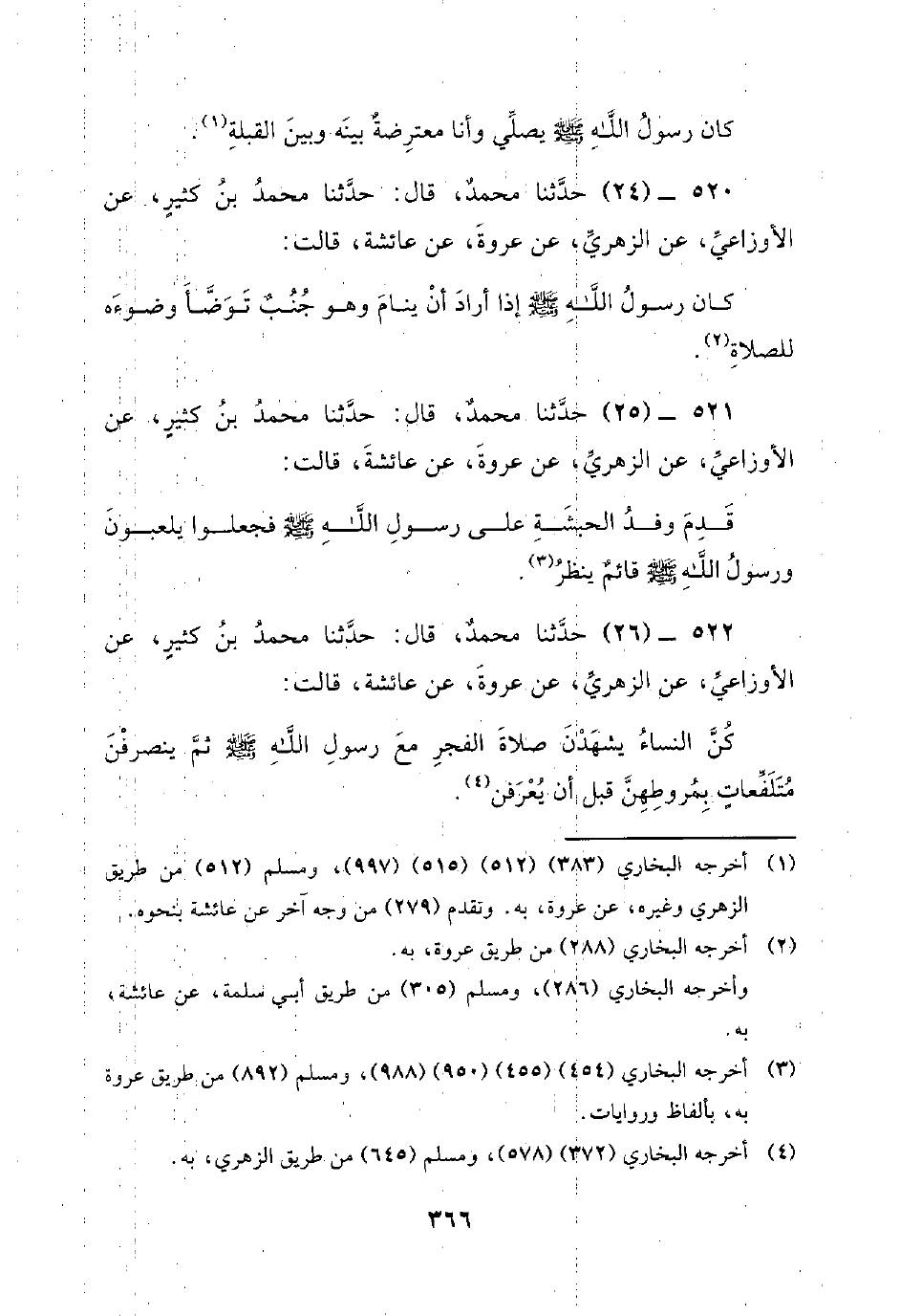 522 - (26) حدثنا محمد، قال: حدثنا محمد بن كثير، عَنِ الأَوْزَاعِيِّ، عَنِ الزُّهْرِيِّ، عَنْ عُرْوَةَ، عَنْ عَائِشَةَ، قَالَتْ: كُنَّ النِّسَاءُ يَشْهَدْنَ صَلاةَ الْفَجْرِ مع رسول الله صلى الله عليه وسلم ثُمَّ يَنْصَرِفْنَ متلفعات بمروطهن قبل أن يعرفن.