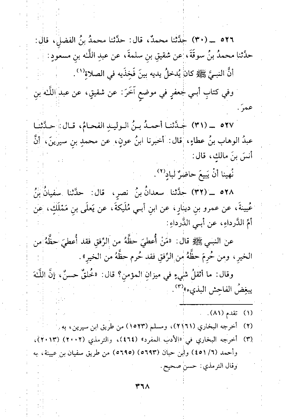 528 - (32) حَدَّثَنَا سَعْدَانُ بْنُ نَصْرٍ، قَالَ: حَدَّثَنَا سُفْيَانُ بْنُ عُيَيْنَةَ، عَنْ عَمْرِو بْنِ دِينَارٍ، عَنِ ابْنِ أَبِي مُلَيْكَةَ، عَنْ يَعْلَى بْنِ مَمْلَكٍ، عَنْ أُمِّ الدَّرْدَاءِ، عَنْ أَبِي الدَّرْدَاءِ: عَنِ النبي صلى الله عليه وسلم قال: من أُعْطِيَ حَظَّهُ مِنَ الرِّفْقِ فَقَدْ أُعْطِيَ حَظَّهُ مِنَ الْخَيْرِ، وَمَنْ حُرِمَ حَظَّهُ مِنَ الرِّفْقِ فَقَدْ حُرِمَ حَظَّهُ مِنَ الْخَيْرِ. وَقَالَ: مَا أَثْقَلُ شَيْءٍ فِي مِيزَانِ الْمُؤْمِنِ؟ قَالَ: خُلُقٌ حَسَنٌ، إِنَّ اللَّهَ يُبْغِضُ الْفَاحِشَ الْبَذِيءَ.
