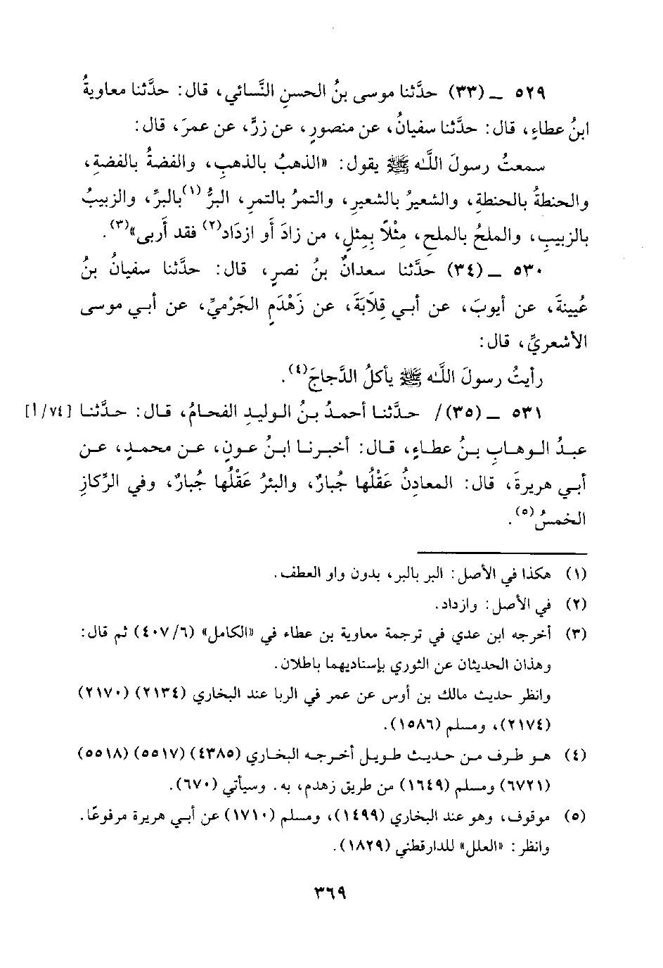 529 - (33) حَدَّثَنَا مُوسَى بْنُ الْحَسَنِ النَّسَائِيُّ، قَالَ: حَدَّثَنَا معاوية ابن عَطَاءٍ، قَالَ: حَدَّثَنَا سُفْيَانُ، عَنْ مَنْصُورٍ، عَنْ زِرٍّ، عَنْ عُمَرَ، قَالَ: سَمِعْتُ رسول الله صلى الله عليه وسلم يقول: الذَّهَبُ بِالذَّهَبِ، وَالْفِضَّةُ بِالْفِضَّةِ، وَالْحِنْطَةُ بِالْحِنْطَةِ، وَالشَّعِيرُ بِالشَّعِيرِ، وَالتَّمْرُ بِالتَّمْرِ، الْبُرُّ بِالْبُرِّ، وَالزَّبِيبُ بِالزَّبِيبِ، وَالْمِلْحُ بِالْمِلْحِ، مِثْلا بِمِثْلٍ، مَنْ زَادَ أَوِ ازْدَادَ فَقَدْ أَرْبَى.