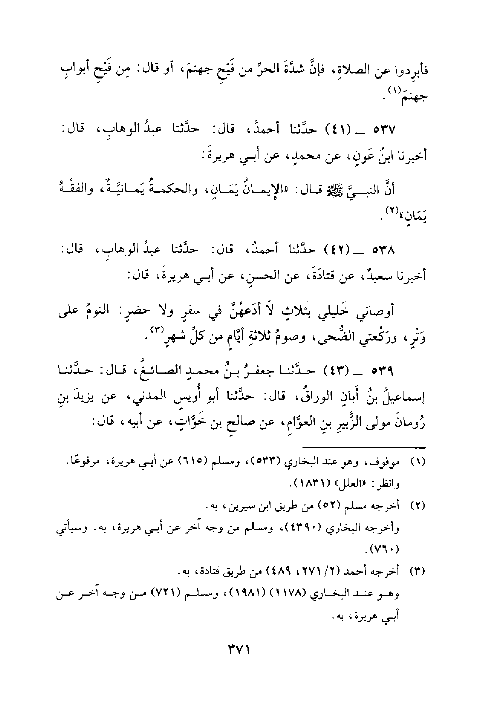 538 - (42) حَدَّثَنَا أَحْمَدُ، قَالَ: حَدَّثَنَا عَبْدُ الْوَهَّابِ، قَالَ: أَخْبَرَنَا سَعِيدٌ، عَنْ قَتَادَةَ، عَنِ الْحَسَنِ، عَنْ أَبِي هُرَيْرَةَ، قَالَ: أَوْصَانِي خَلِيلِي بِثَلاثٍ لا أَدَعُهُنَّ فِي سَفَرٍ وَلا حَضَرٍ: النَّوْمِ عَلَى وِتْرٍ، وَرَكْعَتَيِ الضُّحَى، وَصَوْمِ ثَلاثَةِ أَيَّامٍ مِنْ كل شهر.