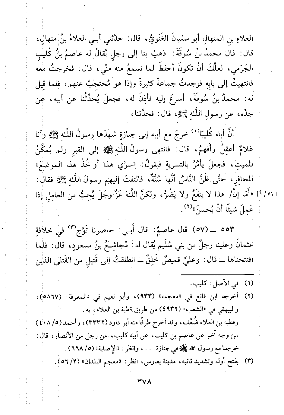 قَالَ عَاصِمٌ: قَالَ أَبِي: فَلَّمَا قَدِمْنَا الْبَصْرَةَ إِذَا النَّاسُ قَدْ عَسْكَرُوا، -[380]- فَقُلْتُ: مَا شأْنُهُمْ؟ قَالَ: بَلَغَهُمْ أَنَّ قَوْمًا سَارُوا إِلَى عُثْمَانَ، فَعَسْكَرُوا لِيُدْرِكُوهُ فَيَنْصُرُوهُ، فَقَامَ عَبْدُ اللَّهِ بْنُ عَامِرِ بْنِ كُرَيْزٍ، فَقَالَ: إِنَّ الأَمِيرَ صَالِحٌ، قَدِ انْصَرَفَ عَنْهُ الْقَوْمُ، قَالَ: فَرَجَعُوا إِلَى مَنَازِلِهِمْ، فَلَمْ يَفْجَأْهُمْ إِلا قَتْلُهُ، قَالَ أَبِي: فَمَا رَأَيْتُ يَوْمًا قَطُّ أَكْثَرَ بَاكِيًا مُنْتَحِبًا تَخَلَّلَ الدُّمُوعُ لِحْيَتَهُ مِنْ ذَلِكَ الْيَوْمِ، فَمَا لَبِثْتُ إِلا قَلِيلا حَتَّى إِذَا فُلانٌ وَفُلانٌ قَدْ قَدِمَا الْبَصْرَةَ، فَمَا لَبِثْتُ إِلا يَسِيرًا حَتَّى إِذَا عَلِيٌّ رَحِمَهُ اللَّهُ قَدْ قَدِمَ، فَنَزَلَ بِذِي قَارٍ، فَقَالَ لِي شَيْخَانِ مِنَ الْحَيِّ: اذْهَبْ بِنَا إِلَى هَذَا الرَّجُلِ فَنَنْظُرَ مَا يَقُولُ وَإِيشِ الَّذِي جَاءَ بِهِ، فَخَرَجْنَا حَتَّى إِذَا دَنَوْنَا مِنَ الْقَوْمِ وَتَبَيَّنَّا فَسَاطِيطَهُمْ إِذَا شَابٌّ خَارِجٌ مِنَ الْعَسْكَرِ - قَالَ الْعَلاءُ: رَأَيْتُ أَنَّهُ قَالَ: عَلَى بَغْلٍ - فَلَمَّا نَظَرْتُ إِلَيْهِ شَبَّهْتُهُ الْمَرْأَةَ - أُرَاهُ قال: التي رأيتها عِنْدَ رَأْسِ الْمَرِيضِ فِي النَّوْمِ - فَقُلْتُ لِصَاحِبِي: لَئِنْ كَانَ لِلْمَرْأَةِ أَخٌ إِنَّ هَذَا لأَخُوهَا، فَقَالَ أَحَدُ الشَّيْخَيْنِ اللَّذَيْنِ مَعِي: مَا تُرِيدُ إِلَى هَذَا، وَغَمَزَنِي بِمِرْفَقِهِ، فَقَالَ الشَّابُّ: أَيُّ شَيْءٍ قُلْتَ؟ قَالَ أَحَدُ الشَّيْخَيْنِ: لَمْ يَقُلْ شَيْئًا، فَانْصَرَفَ، قَالَ: لِتُخْبِرْنِي مَا قُلْتَ، قَالَ: فَقَصَصْتُ عَلَيْهِ الرُّؤْيَا، فَارْتَاعَ لَهَا، ثُمَّ لَمْ يَزَلْ يَقُولُ: لَقَدْ رَأَيْتُ لَقَدْ رَأَيْتُ حَتَّى انْقَطَعَ عَنْهُ صَوْتُهُ، فَقُلْتُ لِبَعْضِ مَنْ لَقِيتُ: مِنَ الشَّابِّ الَّذِي رَأَيْتُ آنِفًا؟ قَالَ: مُحَمَّدُ بْنُ أَبِي بَكْرٍ، فَلَمَّا قَدِمْتُ الْعَسْكَرَ قَدِمْتُ عَلَى أَدْهَى الْعَرَبِ - يَعْنِي: عَلِيًّا - قَالَ: وَاللَّهِ لَيَدْخُلُ عَلِيٌّ فِي نَسَبِ قَوْمِي حَتَّى جَعَلْتُ أَقُولُ: وَاللَّهِ، لَهُوَ أَعْلَمُ بِهِمْ مِنِّي، حَتَّى قَالَ: أَمَا إِنَّ بَنِي رَاسِبٍ بِالْبَصْرَةِ أَكْثَرُ مِنْ بَنِي قُدَامَةَ؟ / قَالَ: قُلْتُ: أَجَلْ، قَالَ: سَيِّدُ قَوْمِكَ أَنْتَ؟ قَالَ: قُلْتُ: لا، وَإِنِّي فِيهِمْ لَمُطَاعٌ، وَلَغَيْرِي أَسْوَدُ مِنِّي وَأَطْوَعُ فِيهِمْ مِنِّي، قَالَ: مَنْ سَيِّدُ بَنِي رَاسِبٍ؟ قَالَ: قُلْتُ: فُلانٌ، قَالَ: فَسَيِّدُ بَنِي قُدَامَةَ؟ قَالَ: قُلْتُ: فُلانٌ لآخَرَ، قَالَ: هَلْ أَنْتَ مُبْلِغُهُمْ عَنِّي كِتَابَيْنِ مِنِّي؟ قُلْتُ: -[381]- نَعَمْ، قَالَ: أَلا تُبَايِعُونِ، قَالَ: فَبَايَعَ اللَّذَانِ مَعِي، قَالَ: وَأَضَبَّ قَوْمٌ كَانُوا عِنْدَهُ - وَقَالَ أبي بيده، فقبضها وحركها وقلبها - كأن فيهم خِفَّةً، قَالَ: فَجَعَلُوا يَقُولُونَ: بَايِعْ، قَالَ: وَقَدْ أَكَلَ السُّجُودُ وُجُوهَهُمْ، فَقَالَ عَلِيٌّ لَهُمْ: دَعُوا الرَّجُلَ، فَقُلْتُ: إِنَّمَا بَعَثَنِي قَوْمِي رَائِدًا وَسَأُنْهِي إِلَيْهِمْ مَا رَأَيْتُ، فَإِنْ بَايَعُوا بَايَعْتُ، وَإِنِ اعْتَزَلُوا اعْتَزَلْتُ، قَالَ: فَقَالَ عَلِيٌّ: أَرَأَيْتَ يَا كُلَيْبُ لَوْ بَعَثَكَ قَوْمُكَ رَائِدًا فَرَأَيْتَ رَوْضَةً وَغَدِيرًا، فَقُلْتَ: يَا قَوْمِ، النَّجْعَةَ النَّجْعَةَ، فَأَبَوْا، أَمَا كُنْتَ تَنْتَجِعُ بِنَفْسِكَ؟ قُلْتُ: بَلَى، قَالَ: فَبَايِعْ، قَالَ: فَأَخَذْتُ بِإِصْبَعٍ مِنْ أَصَابِعِهِ ثُمَّ قُلْتُ: نُبَايِعُكَ عَلَى أَنْ نُطِيعَكَ مَا أَطَعْتَ اللَّهَ، فَإِذَا عَصَيْتَهُ فَلا طَاعَةَ لَكَ عَلَيْنَا، قَالَ: نَعَمْ، وَطَوَّلَ بِهَا صَو