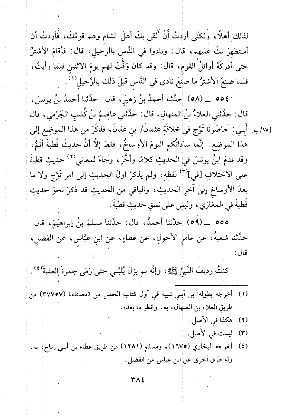 555 - (59) حَدَّثَنَا أَحْمَدُ، قَالَ: حَدَّثَنَا مُسْلِمُ بْنُ إِبْرَاهِيمَ، قَالَ: حَدَّثَنَا شُعْبَةُ، عَنْ عَامِرٍ الأَحْوَلِ، عَنْ عَطَاءٍ، عَنِ ابْنِ عَبَّاسٍ، عَنِ الْفَضْلِ، قَالَ: كُنْتُ رَدِيفَ النَّبِيِّ صَلَّى اللَّهُ عَلَيْهِ وَسَلَّمَ، وَإِنَّهُ لَمْ يَزَلْ يُلَبِّي حَتَّى رَمَى جَمْرَةَ العقبة
