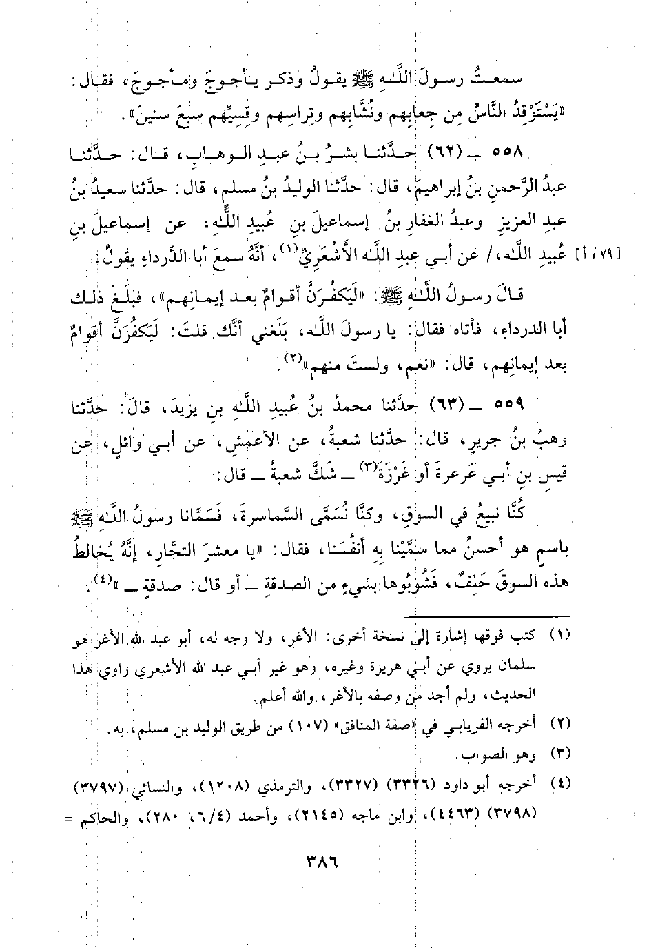 558 - (62) حَدَّثَنَا بِشْرُ بْنُ عَبْدِ الْوَهَّابِ، قَالَ: حَدَّثَنَا عَبْدُ الرَّحْمَنِ بْنِ إِبْرَاهِيمَ، قَالَ: حَدَّثَنَا الْوَلِيدُ بْنُ مُسْلِمٍ، قَالَ: حَدَّثَنَا سَعِيدُ بْنُ عَبْدِ الْعَزِيزِ وَعَبْدُ الْغَفَّارِ بْنُ إِسْمَاعِيلَ بْنِ عُبَيْدِ اللَّهِ، عَنْ إِسْمَاعِيلَ بْنِ عُبَيْدِ اللَّهِ، / عَنْ أَبِي عَبْدِ اللَّهِ الأَشْعَرِيِّ، أَنَّهُ سَمِعَ أَبَا الدَّرْدَاءِ يَقُولُ: قَالَ رَسُولُ اللَّهِ صَلَّى اللَّهُ عَلَيْهِ وَسَلَّمَ: لَيَكْفُرَنَّ أَقْوَامٌ بَعْدَ إِيمَانِهِمْ، فَبَلَغَ ذَلِكَ أَبَا الدَّرْدَاءِ، فَأَتَاهُ فَقَالَ: يَا رَسُولَ اللَّهِ، بَلَغَنِي أَنَّكَ قُلْتَ: لَيَكْفُرَنَّ أَقْوَامٌ بَعْدَ إِيمَانِهِمْ، قَالَ: نَعَمْ، وَلَسْتَ مِنْهُمْ.