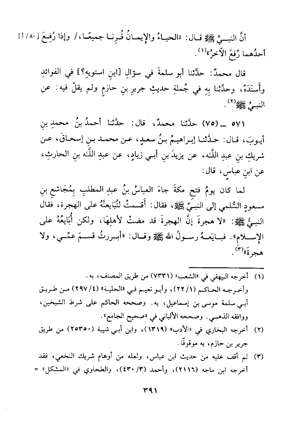 571 - (75) حَدَّثَنَا مُحَمَّدُ، قال: حَدَّثَنَا أَحْمَدُ بْنُ مُحَمَّدِ بْنِ أَيُّوبَ، قَالَ: حَدَّثَنَا إِبْرَاهِيمُ بْنُ سَعْدٍ، عَنْ مُحَمَّدِ بْنِ إِسْحَاقَ، عَنْ شَرِيكِ بْنِ عَبْدِ اللَّهِ، عَنْ يَزِيدَ بْنِ أَبِي زِيَادٍ، عَنْ عَبْدِ اللَّهِ بْنِ الْحَارِثِ، عَنِ ابْنِ عَبَّاسٍ، قَالَ: لَمَّا كَانَ يَوْمُ فَتْحِ مَكَّةَ جَاءَ الْعَبَّاسُ بْنُ عَبْدِ الْمُطَّلِبِ بِمُجَاشِعِ بْنِ مَسْعُودٍ السُّلَمِيِّ إِلَى النَّبِيِّ صَلَّى اللَّهُ عَلَيْهِ وسلم، فقال: أقسمت لتبايعنه عَلَى الْهِجْرَةِ، فَقَالَ النَّبِيُّ صَلَّى اللَّهُ عَلَيْهِ وَسَلَّمَ: لا هِجْرَةَ إِنَّ الْهِجْرَةَ قَدْ مَضَتْ لأَهْلِهَا، وَلَكِنْ أُبَايِعُهُ عَلَى الإِسْلامِ. فَبَايَعَهُ رَسُولُ اللَّهِ صَلَّى اللَّهُ عَلَيْهِ وَسَلَّمَ وَقَالَ: أَبْرَرْتُ قسم عمي، ولا هجرة.