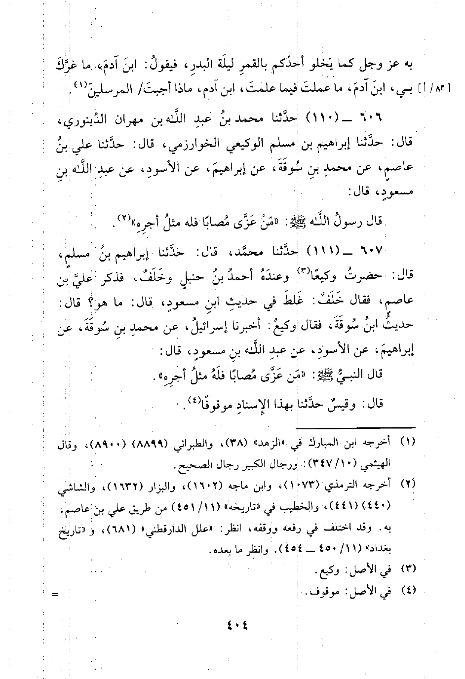 607 - (111) حدثنا محمد، قَالَ: حَدَّثَنَا إِبْرَاهِيمُ بْنُ مُسْلِمٍ، قَالَ: حَضَرْتُ وكيعا وعنده أَحْمَدَ بْنِ حَنْبَلٍ وَخَلْفٌ، فَذَكَرَ عَلِيَّ بْنَ عَاصِمٍ، فَقَالَ خَلَفٌ: غَلَطَ فِي حَدِيثِ ابْنِ مسعود، قال: ما هو؟ قال: حديث ابْنُ سُوقَةَ، فَقَالَ وَكِيعٌ: أَخْبَرَنَا إِسْرَائِيلُ، عَنْ مُحَمَّدِ بْنِ سُوقَةَ، عَنْ إِبْرَاهِيمَ، عَنِ الأَسْوَدِ، عَنْ عَبْدِ اللَّهِ بْنِ مَسْعُودٍ، قَالَ: قَالَ النَّبِيُّ صَلَّى اللَّهُ عَلَيْهِ وسلم: من عزى مصابا فله مثل أجره. قَالَ: وَقَيْسٌ حَدَّثَنَا بهذا الإسناد موقوفا.