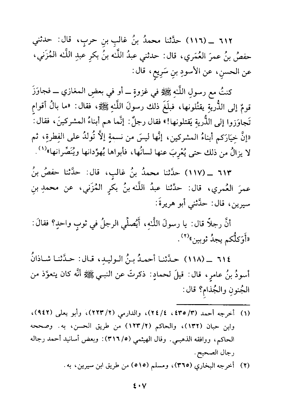 612 - (116) حَدَّثَنَا مُحَمَّدُ بْنُ غَالِبِ بْنِ حَرْبٍ، قَالَ: حَدَّثَنِي حَفْصُ بْنُ عُمَرَ الْعُمَرِيُّ، قَالَ: حَدَّثَنِي عبد الله بن بكر عَبْدِ اللَّهِ الْمُزَنِيُّ، عَنِ الْحَسَنِ، عَنِ الأَسْوَدِ بْنِ سَرِيعٍ، قَالَ: كُنْتُ مَعَ رَسُولِ اللَّهِ صَلَّى اللَّهُ عَلَيْهِ وَسَلَّمَ فِي غَزْوَةٍ أَوْ فِي بَعْضِ الْمَغَازِي - فَجَاوَزَ قَوْمٌ إِلَى الذُّرِّيَّةِ يَقْتُلُونَهَا، فَبَلَغَ ذَلِكَ رَسُولِ اللَّهِ صَلَّى اللَّهُ عَلَيْهِ وَسَلَّمَ، فَقَالَ: مَا بَالُ أَقْوَامٍ تَجَاوَزُوا إِلَى الذُّرِّيَّةِ يَقْتُلُونَهَا! فَقَالَ رَجُلٌ: إِنَّمَا هُمْ أَبْنَاءُ الْمُشْرِكِينَ، فَقَالَ: إِنَّ خِيَارَكُمْ أَبْنَاءُ الْمُشْرِكِينَ، إِنَّهَا لَيْسَ مِنْ نَسَمَةٍ إِلا تُولَدُ عَلَى الْفِطْرَةِ، ثُمَّ لا يَزَالُ مِنْ ذَلِكَ حَتَّى يُعْرِبَ عَنْهَا لِسَانُهَا، فَأَبَوَاهَا يُهَوِّدَانِهَا وَيُنَصِّرَانِهَا.