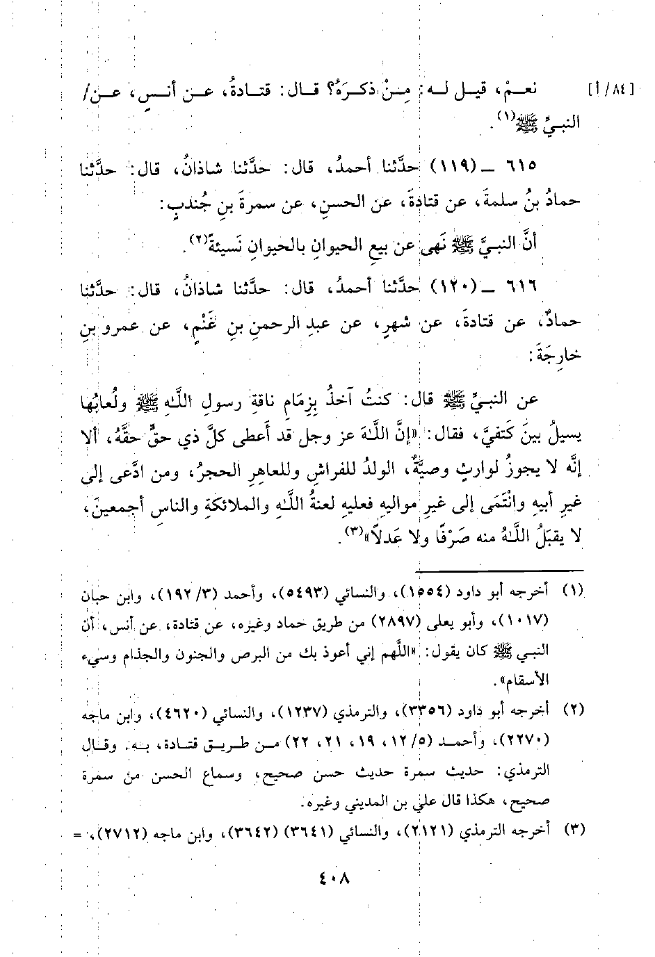 616 - (120) حَدَّثَنَا أَحْمَدُ، قَالَ: حَدَّثَنَا شَاذَانُ، قَالَ: حَدَّثَنَا حَمَّادٌ، عَنْ قَتَادَةَ، عَنْ شَهْرٍ، عَنْ عَبْدِ الرَّحْمَنِ بْنِ غَنْمٍ، عَنْ عَمْرِو بْنِ خَارِجَةَ: عَنِ النَّبِيِّ صَلَّى اللَّهُ عَلَيْهِ وَسَلَّمَ قَالَ: كُنْتُ آخُذُ بِزِمَامِ نَاقَةِ رَسُولِ اللَّهِ صَلَّى اللَّهُ عَلَيْهِ وَسَلَّمَ وَلُعَابُهَا يَسِيلُ بَيْنَ كَتِفَيَّ، فَقَالَ: إِنَّ اللَّهَ عَزَّ وَجَلَّ قَدْ أَعْطَى كُلَّ ذِي حَقٍّ حَقَّهُ، أَلا إِنَّهُ لا يَجُوزُ لِوَارِثٍ وَصِيَّةٌ، الْوَلَدُ لِلْفِرَاشِ وَلِلْعَاهِرِ الْحَجَرُ، وَمَنِ ادَّعَى إِلَى غَيْرِ أَبِيهِ وَانْتَمَى إِلَى غَيْرِ مَوَالِيهِ فَعَلَيْهِ لَعْنَةُ اللَّهِ وَالْمَلائِكَةِ وَالنَّاسِ أَجْمَعِينَ، لا يَقْبَلُ اللَّهُ مِنْهُ صَرْفًا وَلا عدلا.