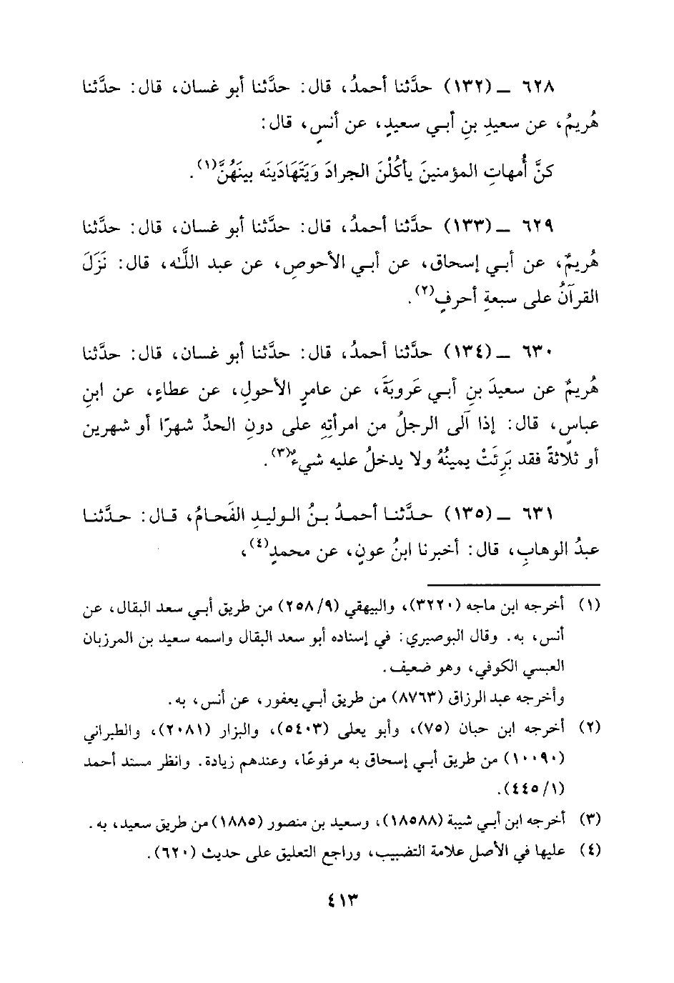 629 - (133) حَدَّثَنَا أَحْمَدُ، قَالَ: حَدَّثَنَا أَبُو غَسَّانَ، قَالَ: حَدَّثَنَا هُرَيْمٌ، عَنْ أَبِي إِسْحَاقَ، عَنْ أَبِي الأَحْوَصِ، عَنْ عَبْدِ اللَّهِ، قَالَ: نَزَلَ الْقُرْآنُ عَلَى سَبْعَةِ أَحْرُفٍ.