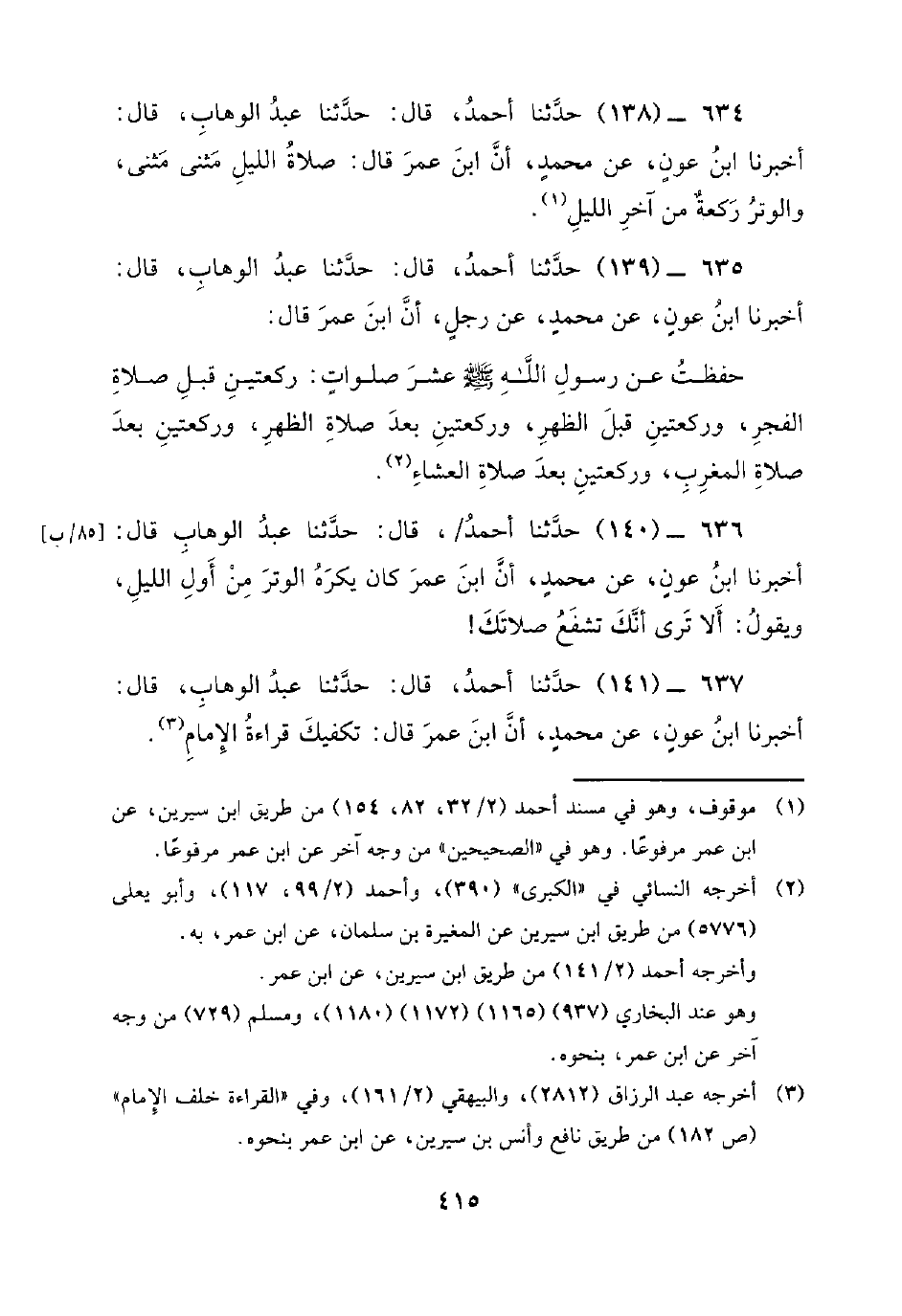 634 - (138) حَدَّثَنَا أَحْمَدُ، قَالَ: حَدَّثَنَا عَبْدُ الْوَهَّابِ، قَالَ: أَخْبَرَنَا ابْنُ عَوْنٍ، عَنْ مُحَمَّدٍ، أَنَّ ابْنَ عُمَرَ قَالَ: صَلاةُ اللَّيْلِ مَثْنَى مَثْنَى وَالْوِتْرُ رَكْعَةٌ مِنْ آخِرِ اللَّيْلِ.