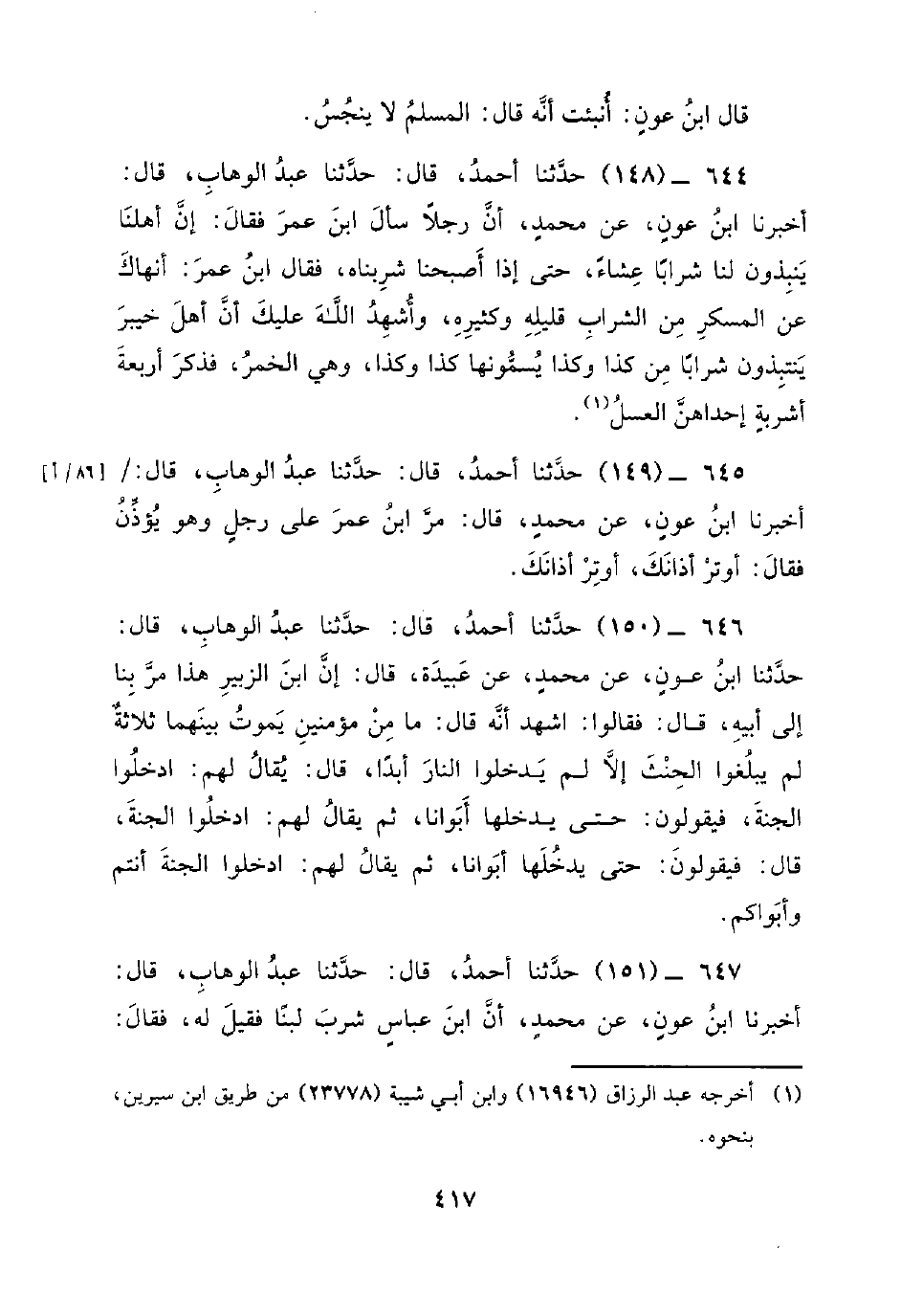 644 - (148) حَدَّثَنَا أَحْمَدُ، قَالَ: حَدَّثَنَا عَبْدُ الْوَهَّابِ، قَالَ: أخبرنا ابن عون، عن محمد، أن رجلا سَأَلَ ابْنَ عُمَرَ فَقَالَ: إِنَّ أَهْلَنَا يَنْبِذُونَ لَنَا شَرَابًا عِشَاءً، حَتَّى إِذَا أَصْبَحْنَا شَرِبْنَاهُ، فَقَالَ ابْنُ عُمَرَ: أَنْهَاكَ عَنِ الْمُسْكِرِ مِنَ الشَّرَابِ قَلِيلِهِ وَكَثِيرِهِ، وَأُشْهِدُ اللَّهَ عَلَيْكَ أَنَّ أَهْلَ خَيْبَرَ يَنْتَبِذُونَ شَرَابًا مِنْ كَذَا وَكَذَا يُسَمُّونَهَا كَذَا وَكَذَا، وَهِيَ الْخَمْرُ، فَذَكَرَ أَرْبَعَةَ أَشْرِبَةٍ إِحْدَاهُنَّ الْعَسَلُ.
