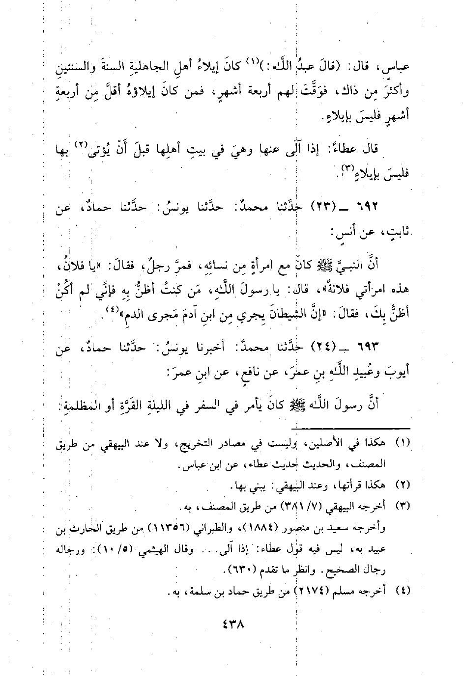 692 - (23) حدثنا محمد: حدثنا يونس: حدثنا حماد، عن ثابت، عن أنس: أن رسول الله صلى الله عليه وسلم كَانَ مَعَ امْرَأَةٍ مِنْ نِسَائِهِ، فَمَرَّ رَجُلٌ، فقال: يا أبا فُلانُ، هذه امرأتي فلانة، قال: يَا رَسُولَ الله، ما كُنْتُ أَظُنُّ بِهِ فَإِنِّي لَمْ أَكُنْ أَظُنُّ بِكَ، فَقَالَ: إِنَّ الشَّيْطَانَ يَجْرِي مِنَ ابْنِ آدَمَ مَجْرَى الدَّمِ.