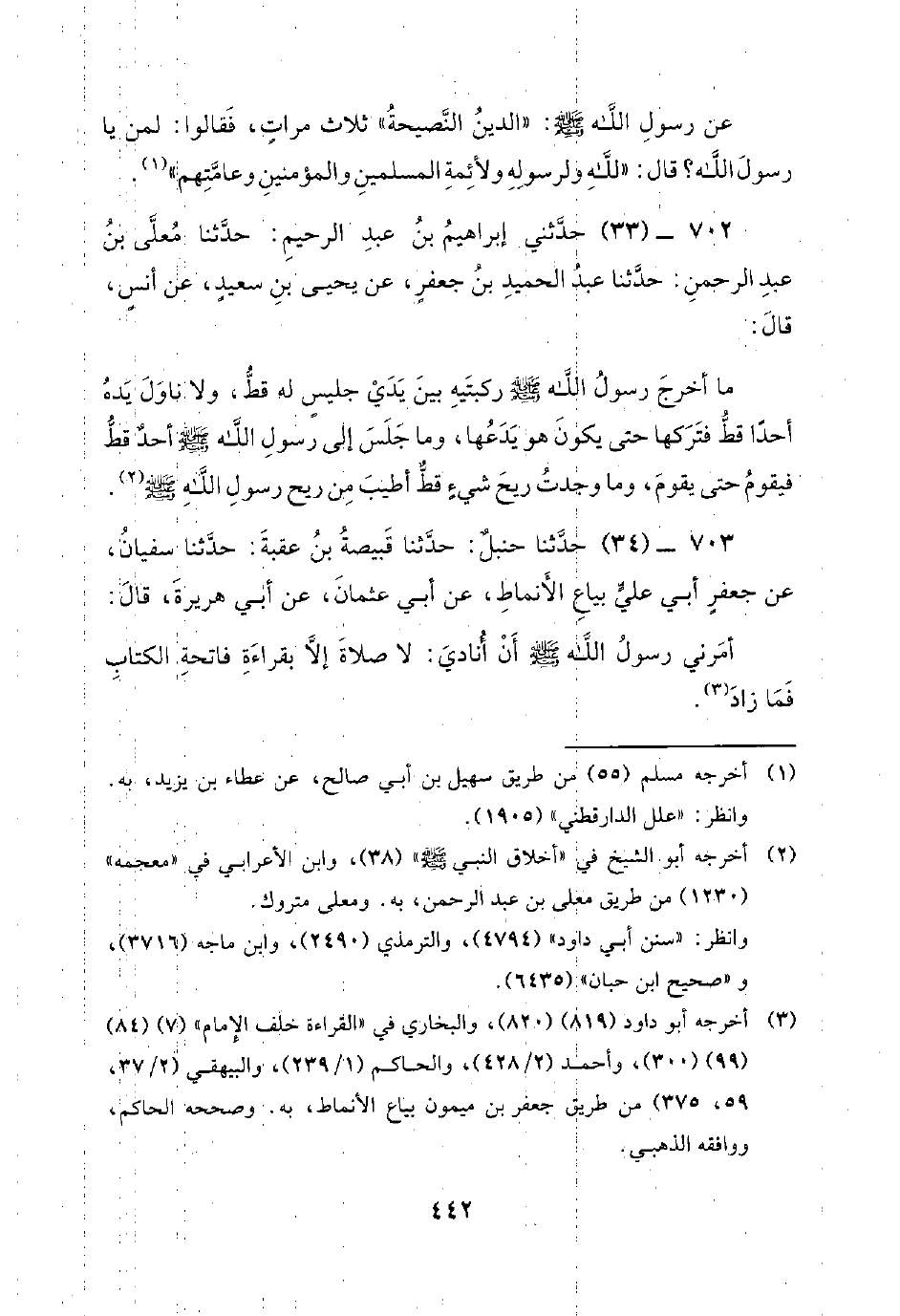703 - (34) حَدَّثَنَا حنبل: حدثنا قبيصة بن عقبة: حدثنا سُفْيَانُ، عَنْ جَعْفَرٍ أَبِي عَلِيٍّ بَيَّاعِ الأَنْمَاطِ، عَنْ أَبِي عُثْمَانَ، عَنْ أَبِي هُرَيْرَةَ، قَالَ: أَمَرَنِي رَسُولِ اللَّهِ صَلَّى اللَّهُ عَلَيْهِ وَسَلَّمَ [إِنَّ] أُنَادِيَ: لا صَلاةَ إِلا بِقِرَاءَةِ فَاتِحَةِ الكتاب فما زاد.