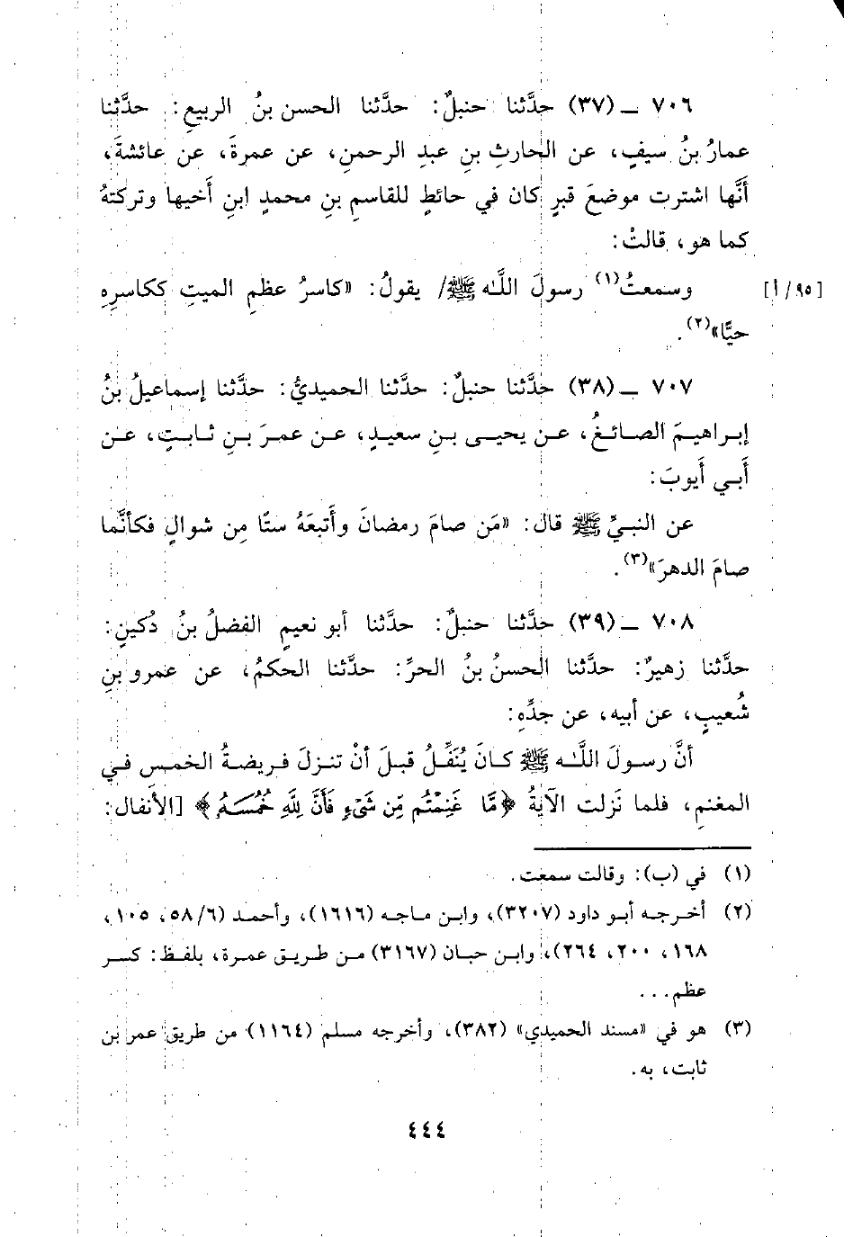 706 - (37) حدثنا حنبل: حدثنا حسن بن الربيع: حدثنا عَمَّارُ بْنُ سَيْفٍ، عَنِ الْحَارِثِ بْنِ عَبْدِ الرَّحْمَنِ، عَنْ عَمْرَةَ، عَنْ عائشة رضي الله عنها، أَنَّهَا اشْتَرَتْ مَوْضِعَ قَبْرٍ كَانَ فِي حَائِطٍ لِلْقَاسِمِ بْنِ محمد ابن أخيها وتركته كما هو، قالت: وسمعت رَسُولَ اللَّهِ صَلَّى اللَّهُ عَلَيْهِ وَسَلَّمَ / يَقُولُ: كَاسِرُ عَظْمِ الْمَيِّتِ كَكَاسِرِهِ حيا.
